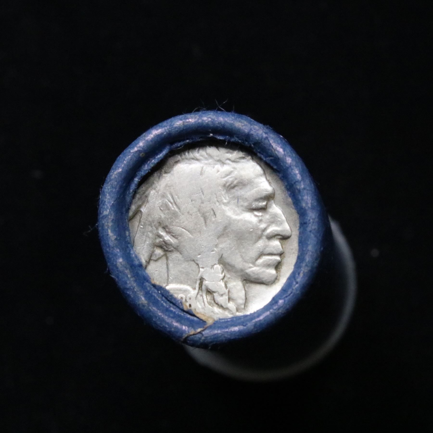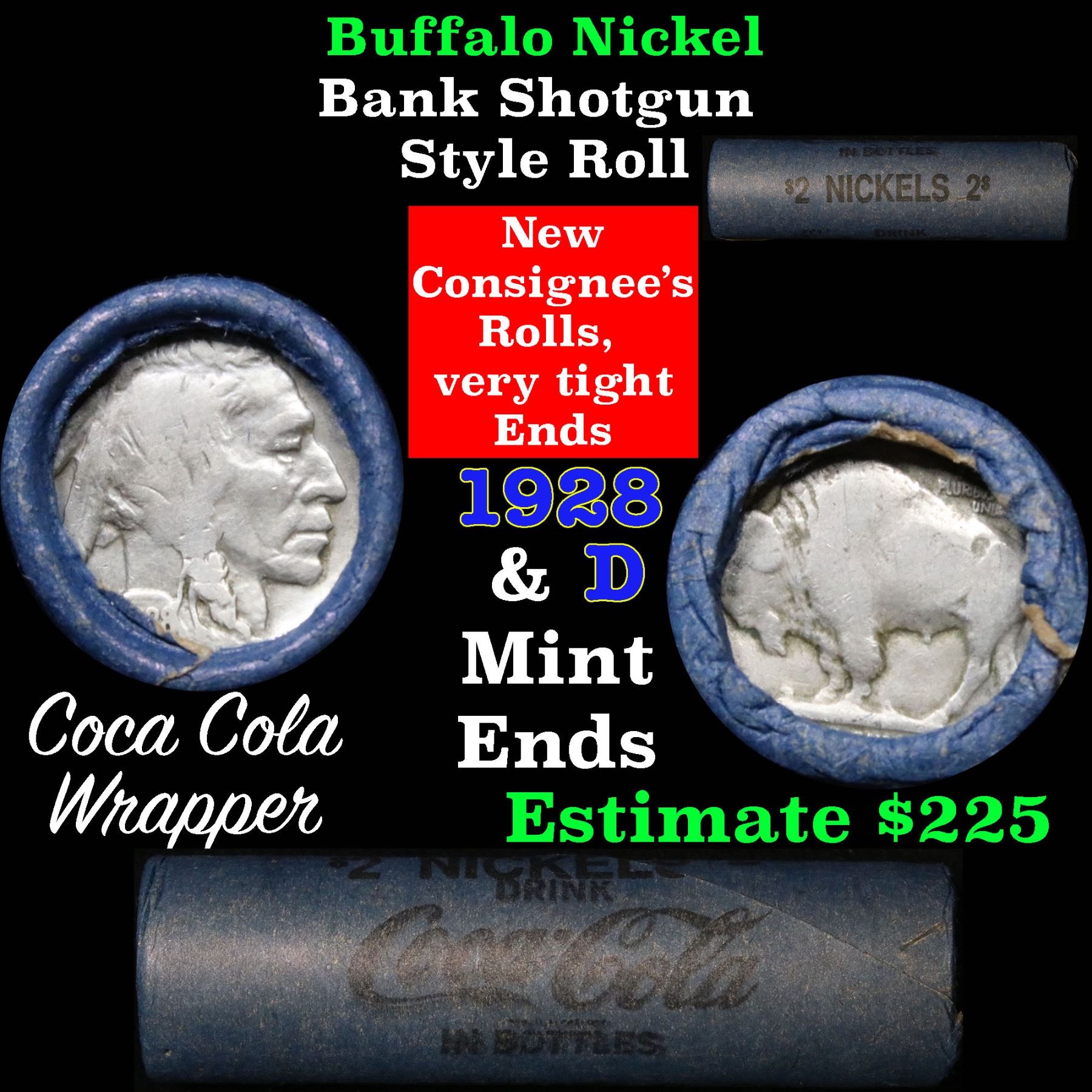 Buffalo Nickel Shotgun Roll in Old Bank Style Wrapper 1928 & d Mint Ends. The roll is held in an old, rare Bank style wrapper. They are all frrom one Estate. The ends on these rolls are very tight. We will guarantee they are all full dates.