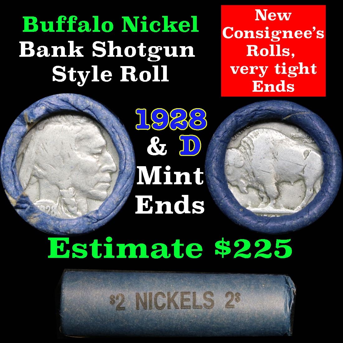 Buffalo Nickel Shotgun Roll in Old Bank Style Wrapper 1928 & d Mint Ends. The roll is held in an old, rare Bank style wrapper. They are all frrom one Estate. The ends on these rolls are very tight. We will guarantee they are all full dates.