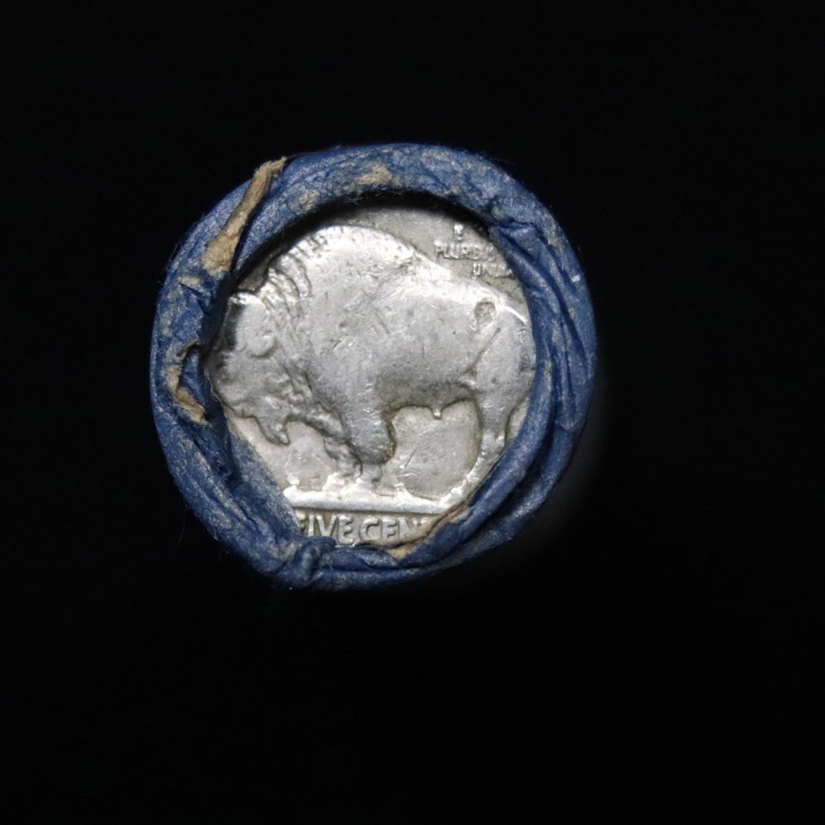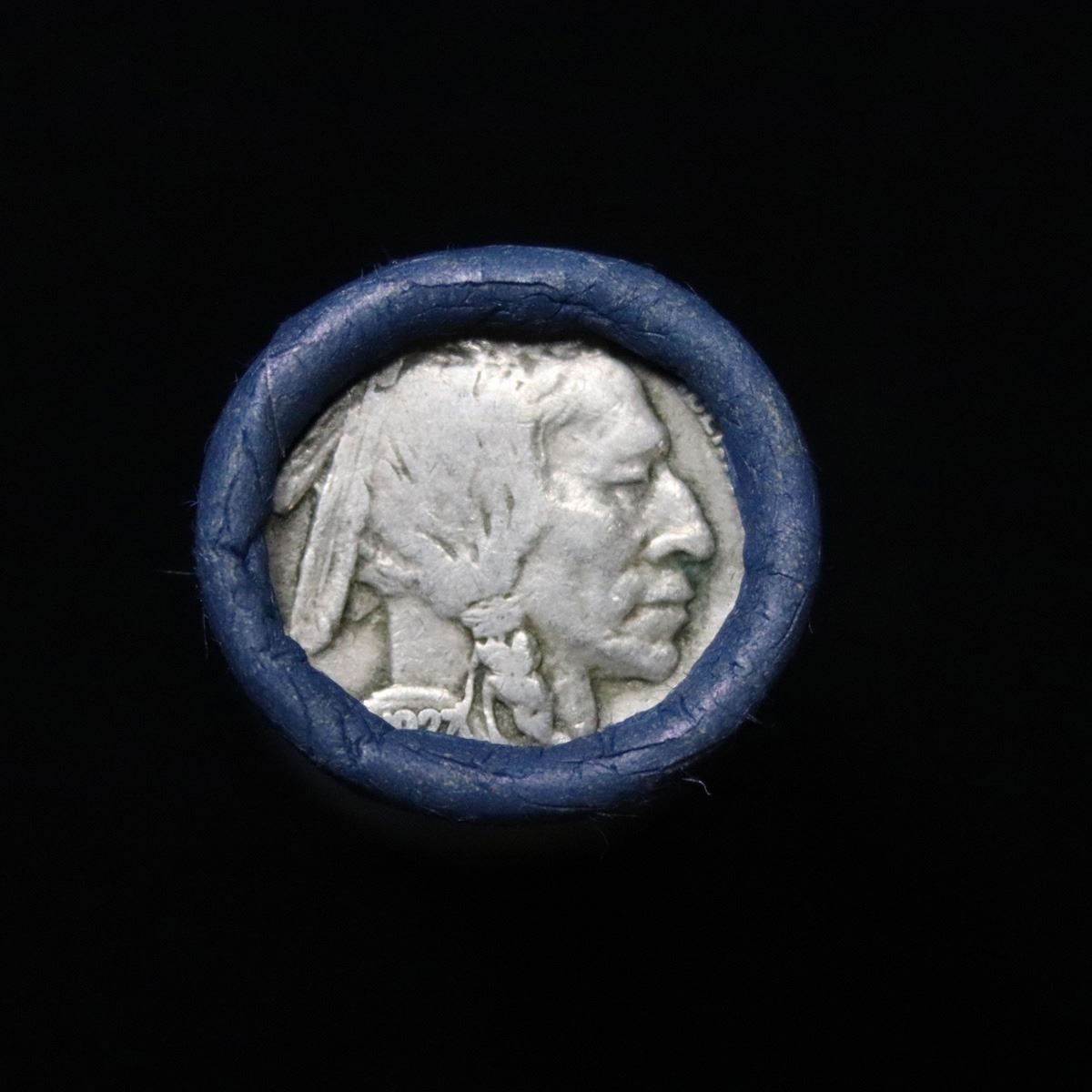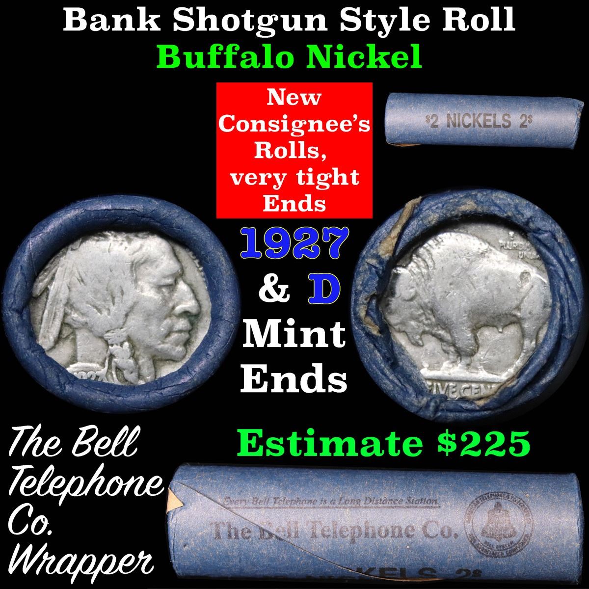 Buffalo Nickel Shotgun Roll in Old Bank Style Wrapper stamped 'Bell Telephone' 1927 & d Mint Ends . .. The roll is held in an old, rare Bank style wrapper stamped with "The Bell Telephone Co" & logo from the 1960's. They are all from one Estate. The ends on these rolls are very tight. We will guarantee they are all full dates.