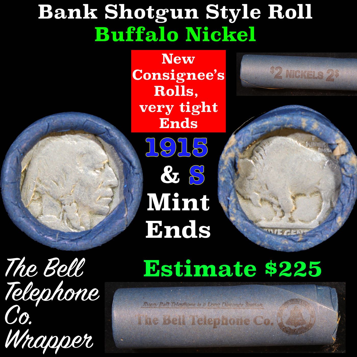 Buffalo Nickel Shotgun Roll in Old Bell Telephone Bank Wrapper 1915 & s Mint Ends. The roll is held in an old Bank style wrapper. They are all frrom one Estate. The ends on these rolls are very tight. We will guarantee they are all full dates.