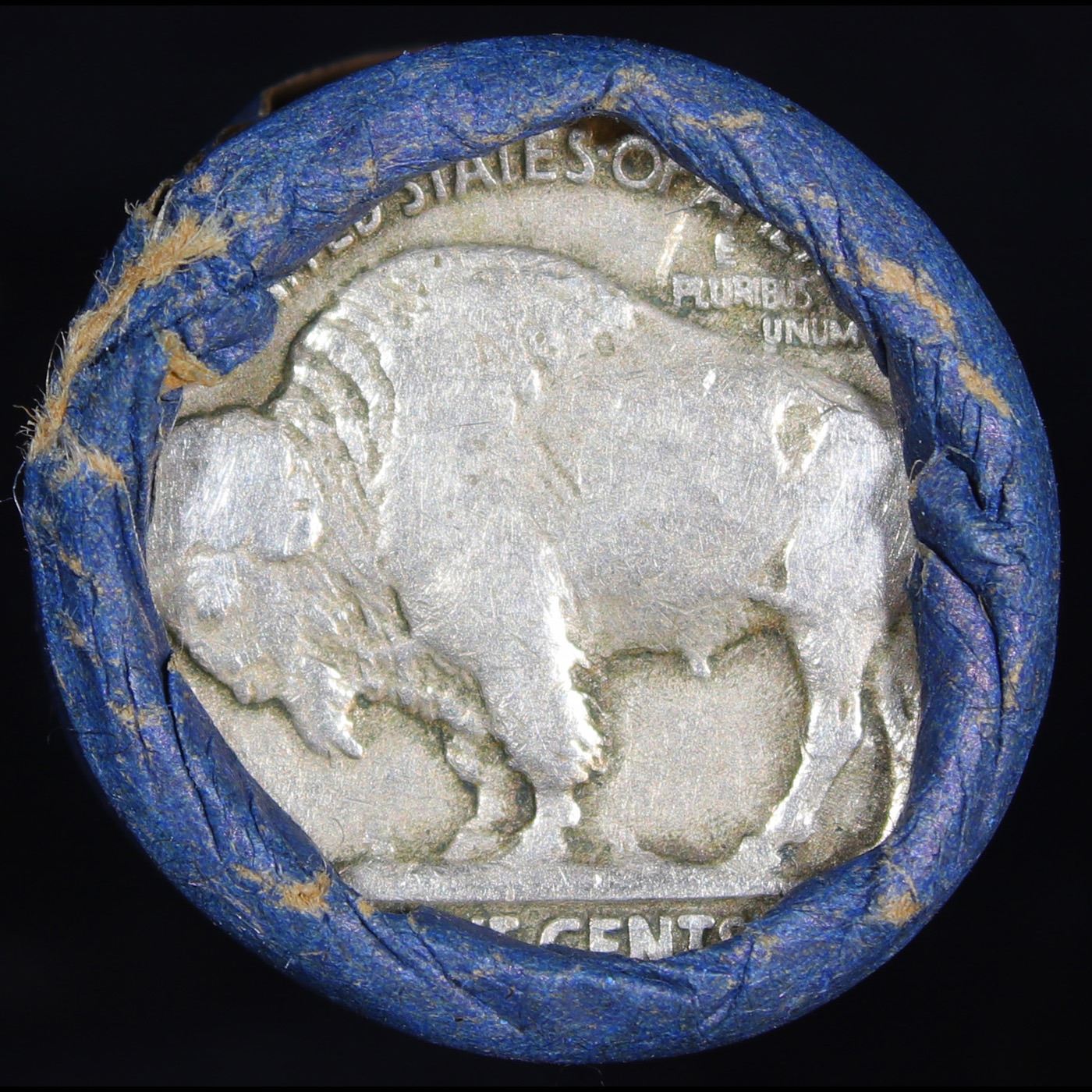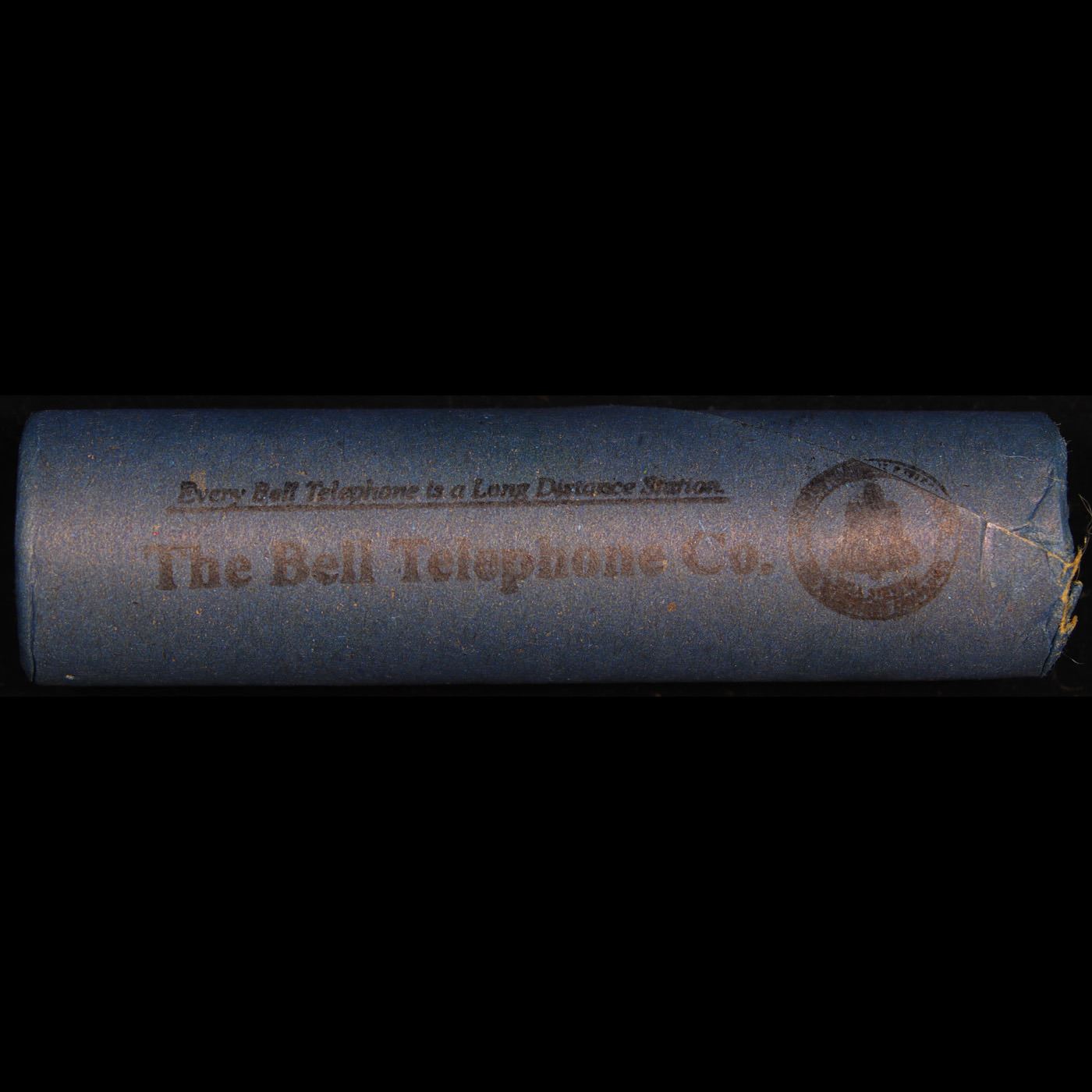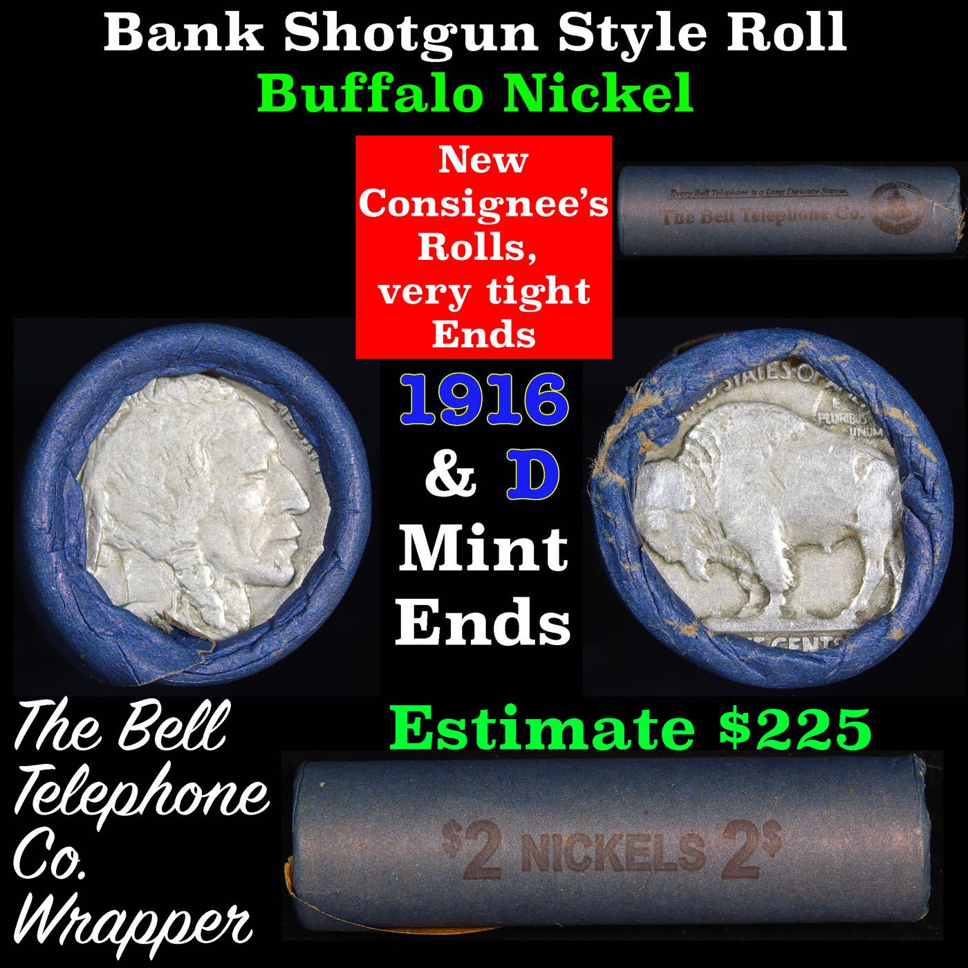 Buffalo Nickel Shotgun Roll in Old Bell Telephone Bank Wrapper 1916 & d Mint Ends. The roll is held in an old Bank style wrapper. They are all frrom one Estate. The ends on these rolls are very tight. We will guarantee they are all full dates.