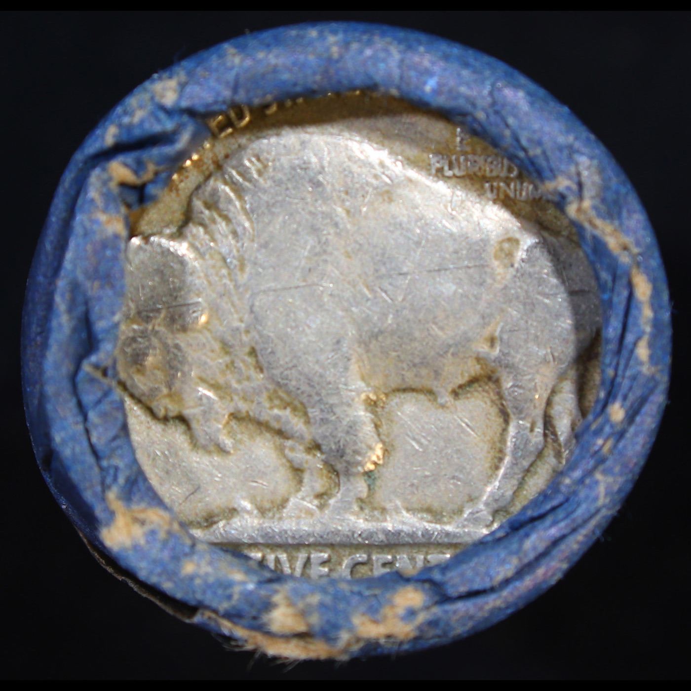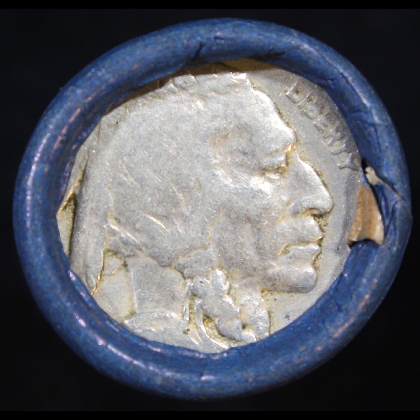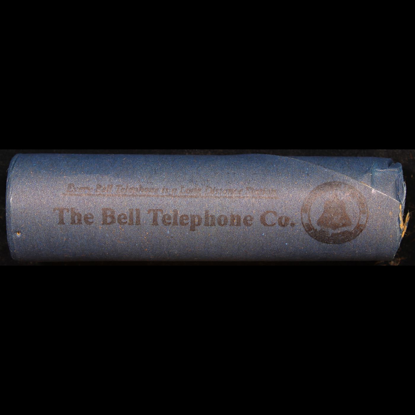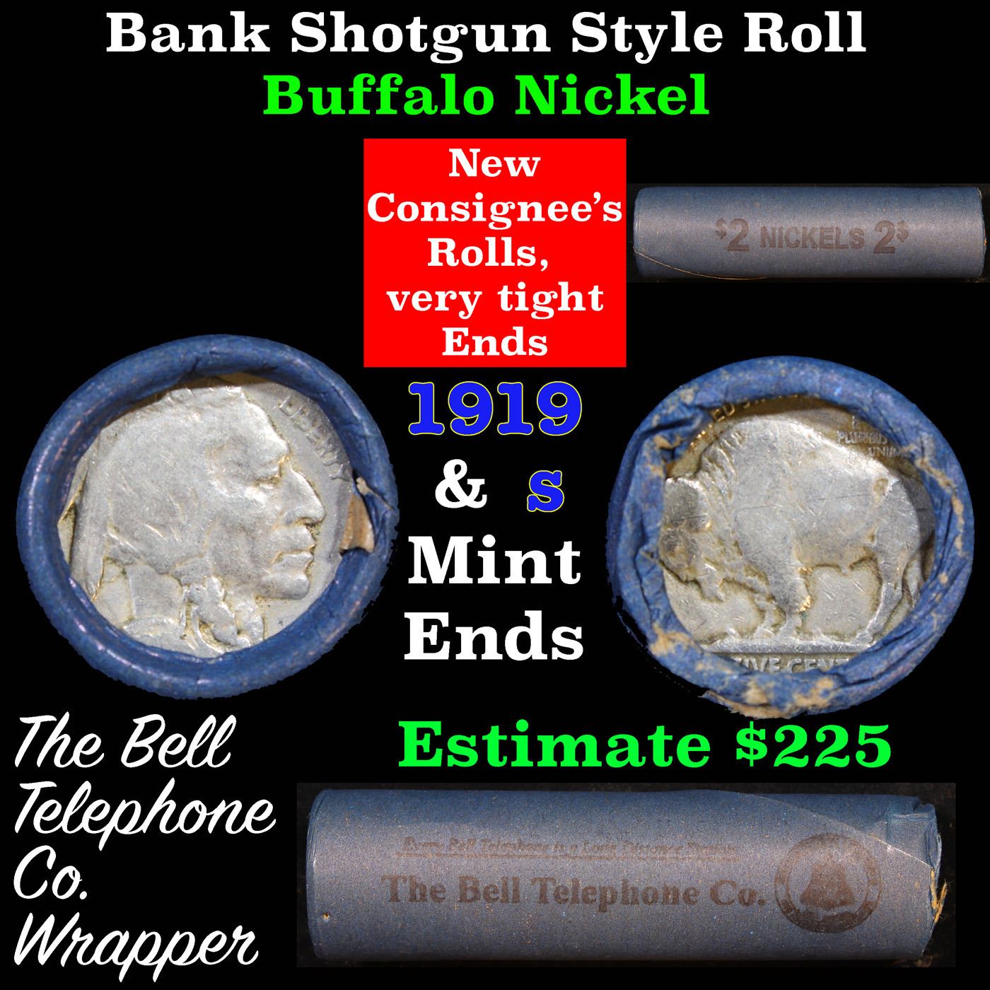 Buffalo Nickel Shotgun Roll in Old Bell Telephone Bank Wrapper 1919 & s Mint Ends. The roll is held in an old Bank style wrapper. They are all frrom one Estate. The ends on these rolls are very tight. We will guarantee they are all full dates.