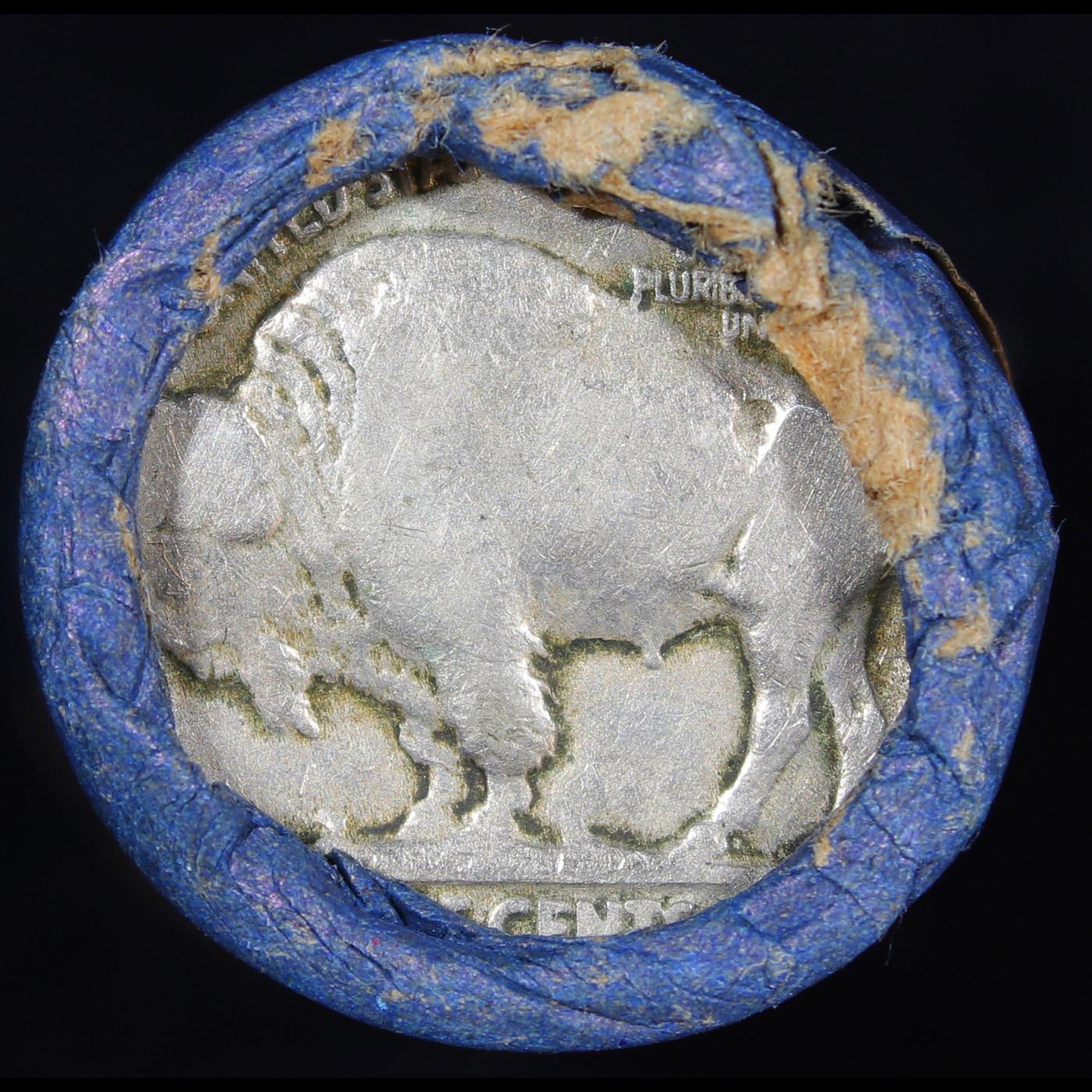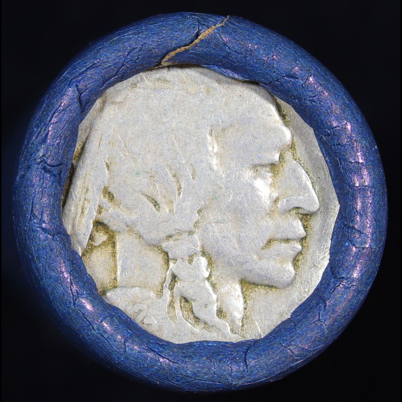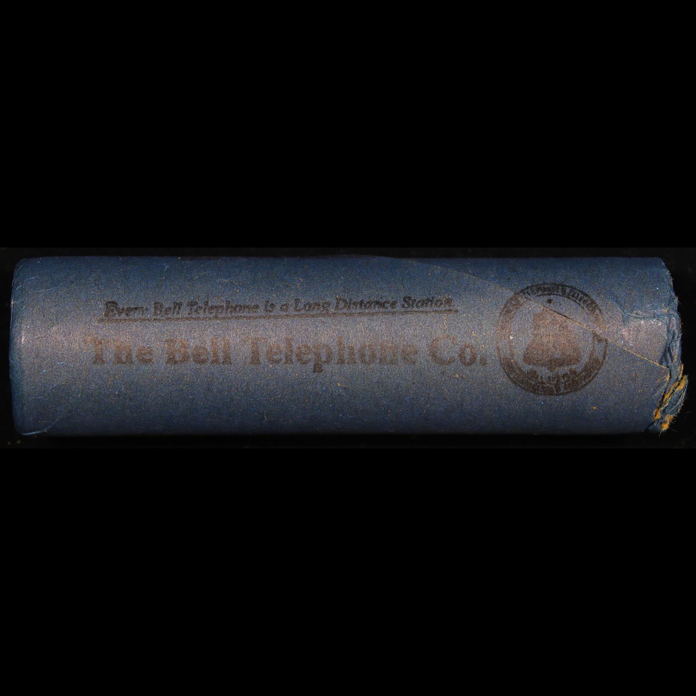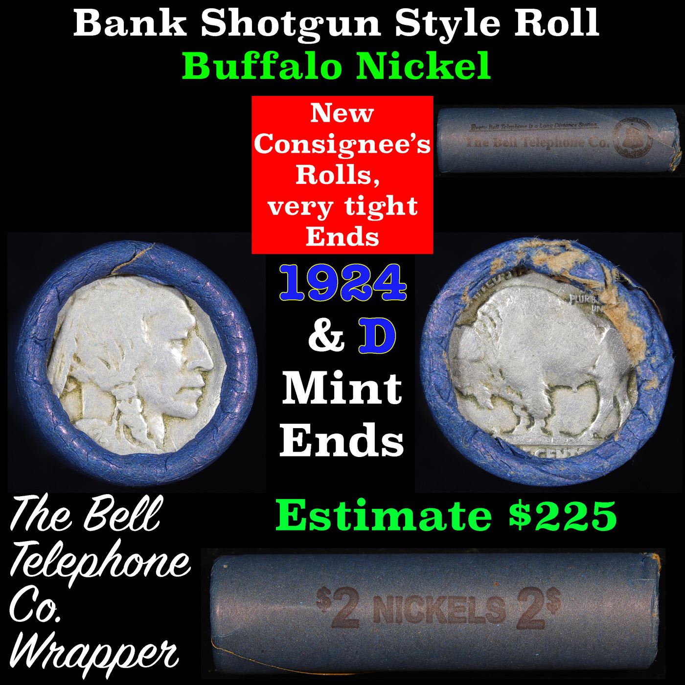 Buffalo Nickel Shotgun Roll in Old Bell Telephone Bank Wrapper 1924 & d Mint Ends. The roll is held in an old Bank style wrapper. They are all frrom one Estate. The ends on these rolls are very tight. We will guarantee they are all full dates.