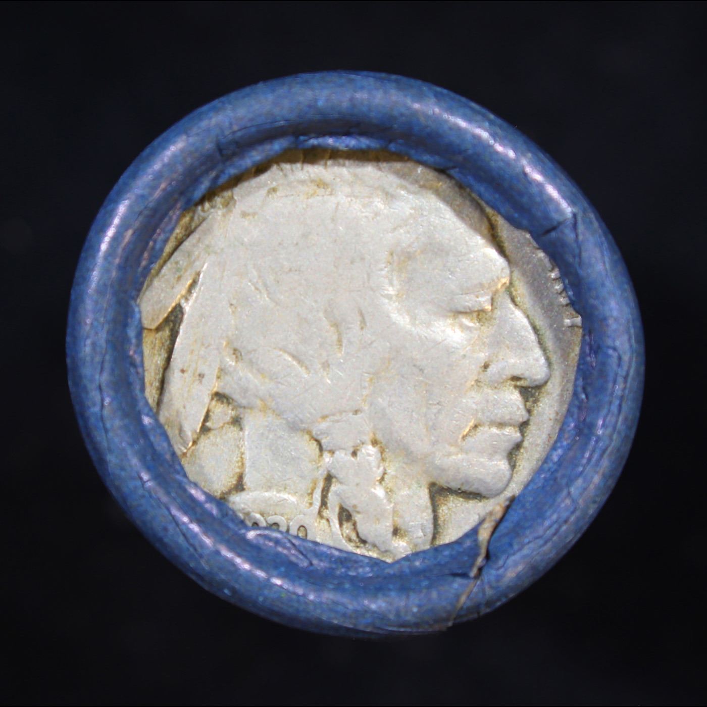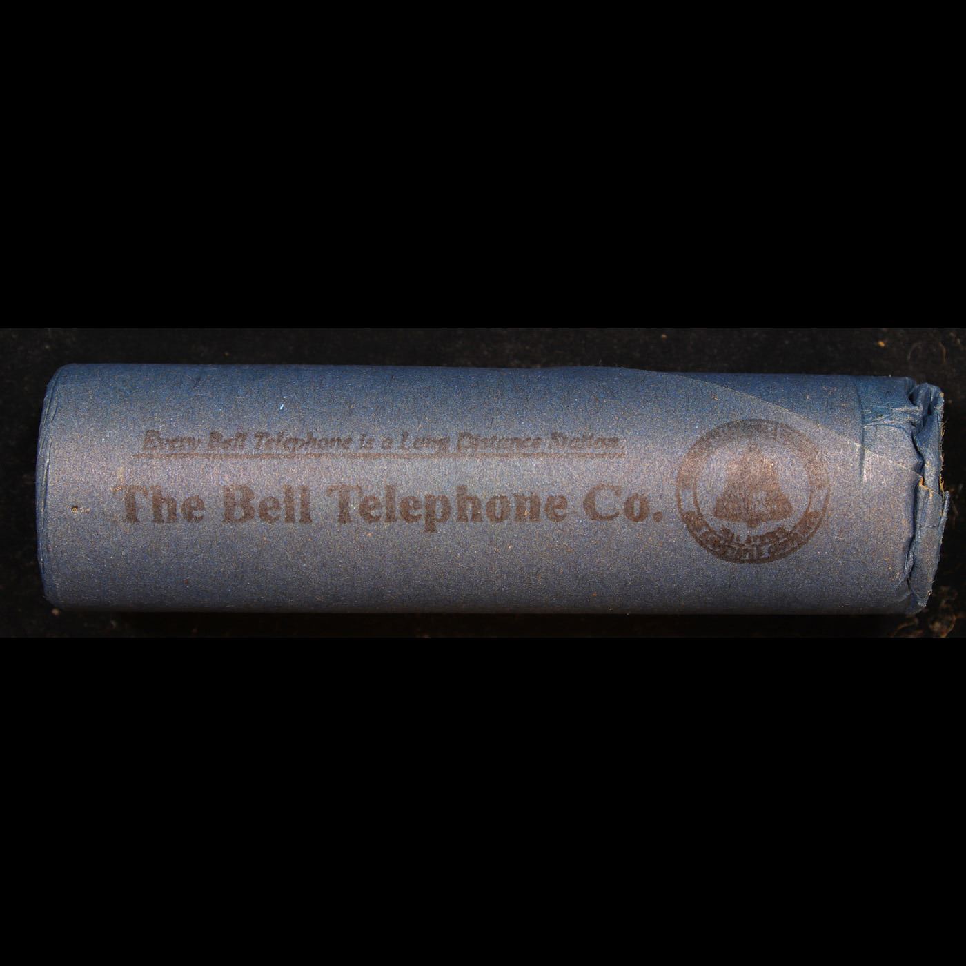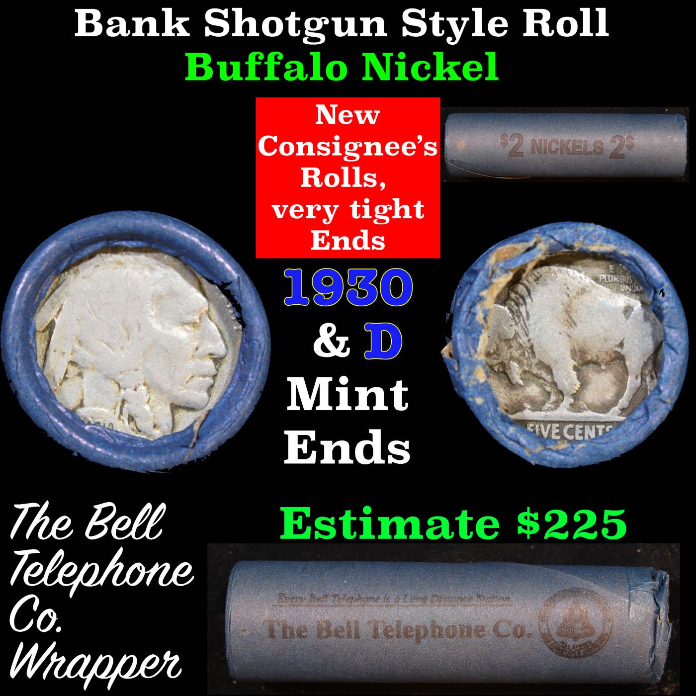 Buffalo Nickel Shotgun Roll in Old Bell Telephone Bank Wrapper 1930 & d Mint Ends. The roll is held in an old Bank style wrapper. They are all frrom one Estate. The ends on these rolls are very tight. We will guarantee they are all full dates.