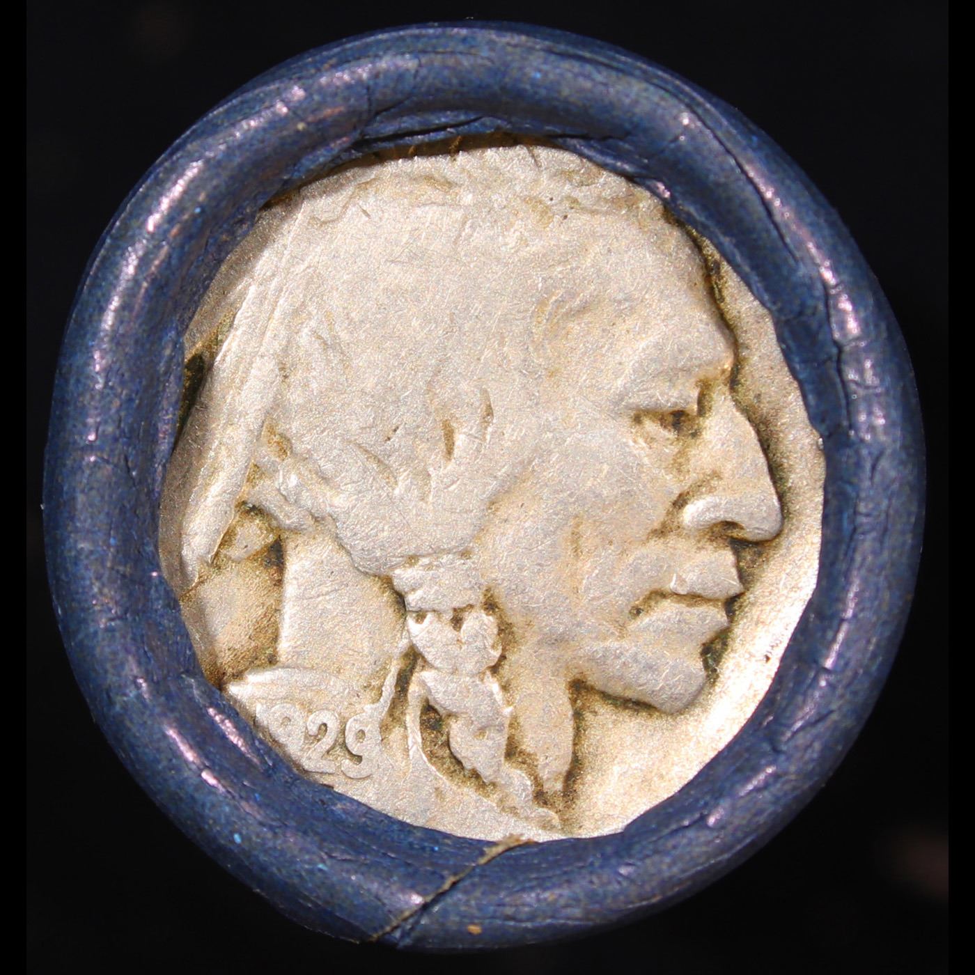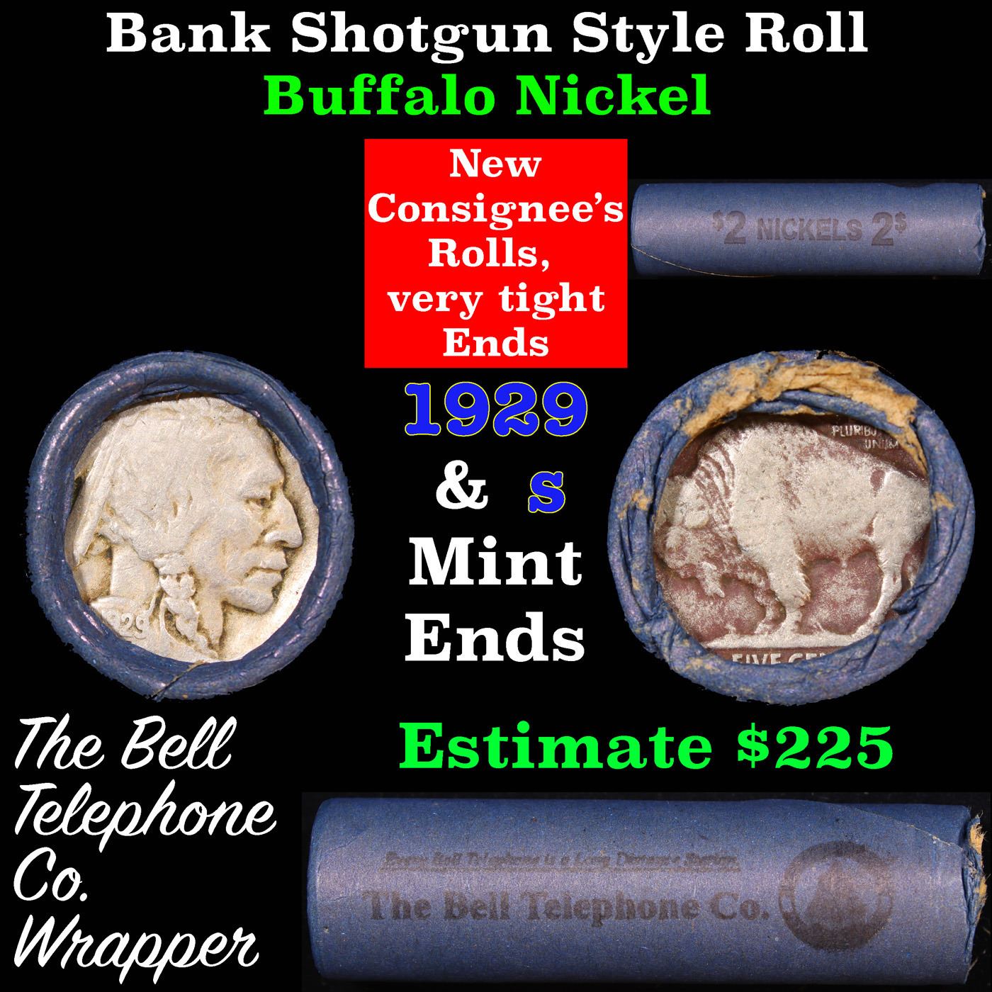 Buffalo Nickel Shotgun Roll in old Bell Telephone Bank Wrapper 1929 & s Mint Ends. The roll is held in an old Bank style Bell Telephone Wrapper. They are all frrom one Estate. The ends on these rolls are very tight. We will guarantee they are all full dates.