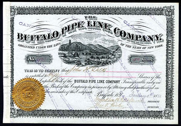 New York. 1880. 50 Shares, I/C Stock. #13. Black print with black border and gold seal on left. Vignette of oil wells with Buffalo top center. VF condition with purple cancellation stamps.