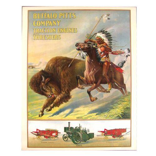 Buffalo Pitts Farm Machinery Sign. Fabulous Color and Graphics of Native American Indian hunting Buffalo. In Period Frame. Excellent Condition. Approx. 22 X 28 inches.
