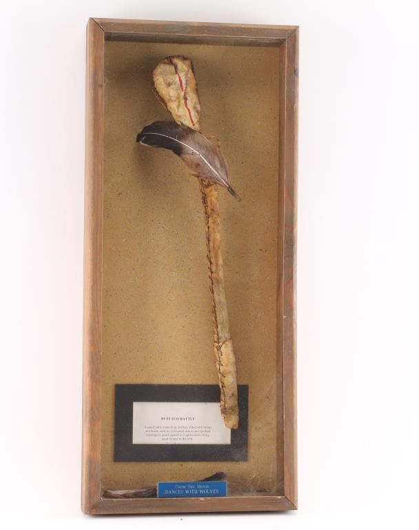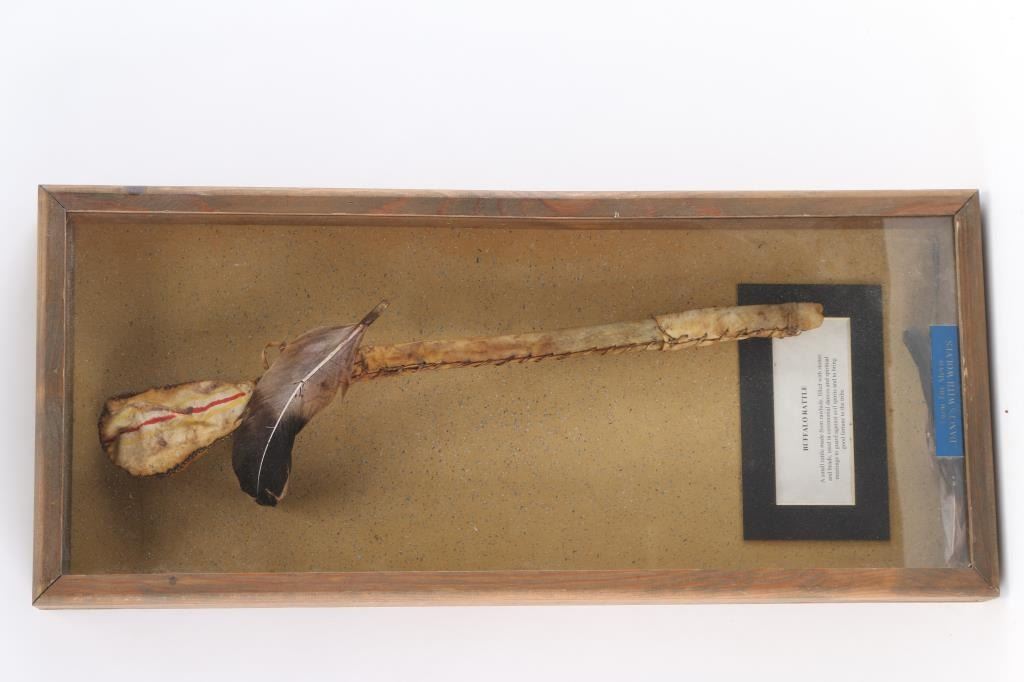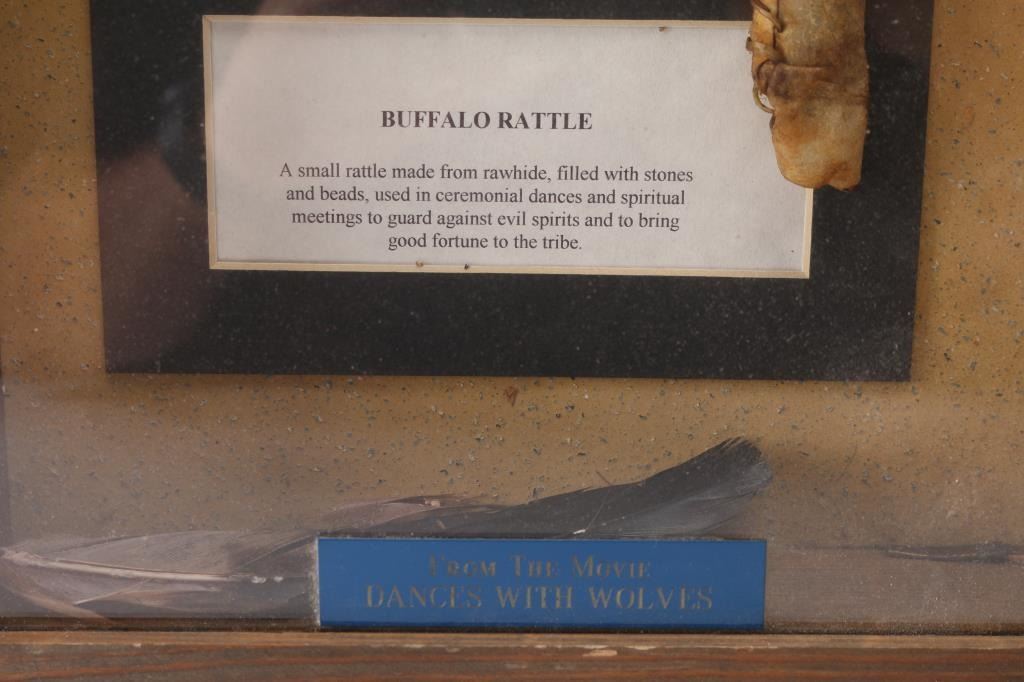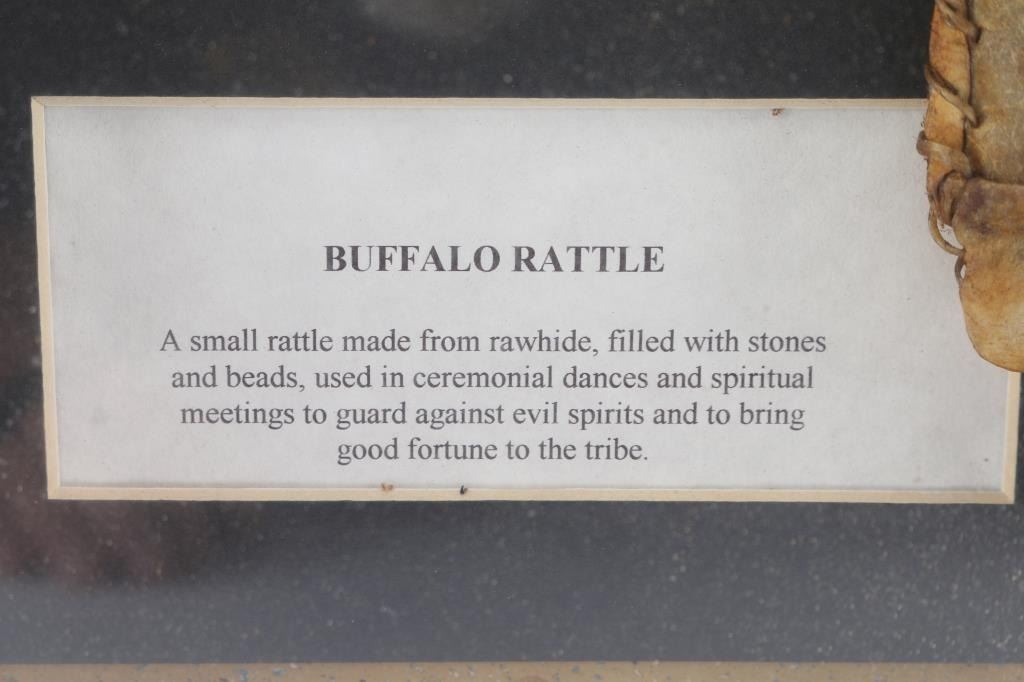 Rawhide buffalo rattle filled with stones and beads. Displayed in shadow box measuring 25" x 11".