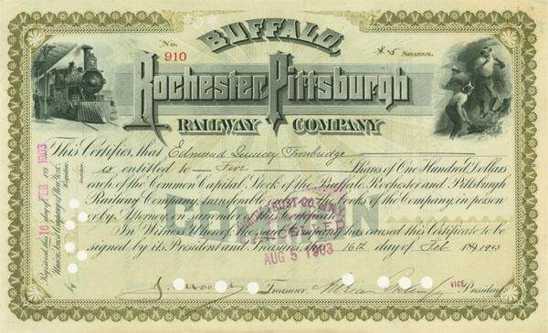 1903. New York. Stock certificate. Olive/Black. Engraved vignettes of steam locomotive at left, coal miners at right. Stamp and punch cancelled. Extremely Fine.
