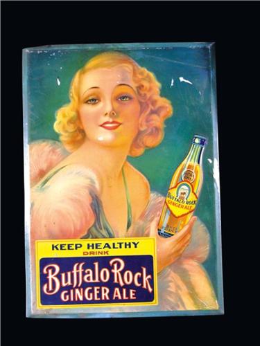 Buffalo Rock Ginger Ale, tin over cardboard, easel back sign. This is the first on of these we have seen. She has a really good look to her. Some staining overall. 13 1/2 X 19 inches.