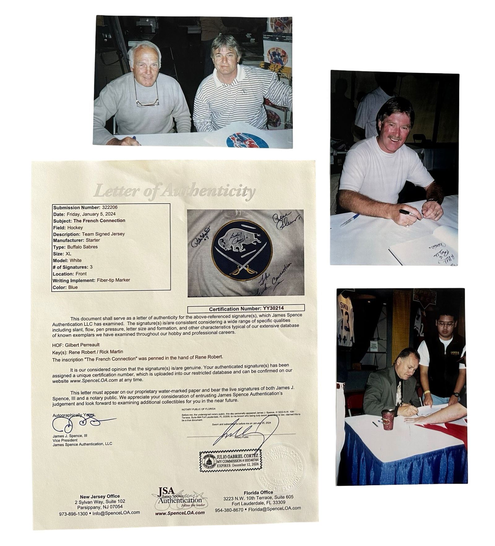 A Buffalo Sabres NHL "The French Connection" signed jersey with 3 different Sabres autographs. Includes autographs of Rick Martin, Gilbert Perrault, and Rene Robert. Signed in person, and included with photographs of Rich Martin (Sept 30, 2002), Gilbert Perrault (Nov. 2001) and Rene Robert (Apr. 30, 2005) at the signings. Included as well with a JSA COA #YY30214