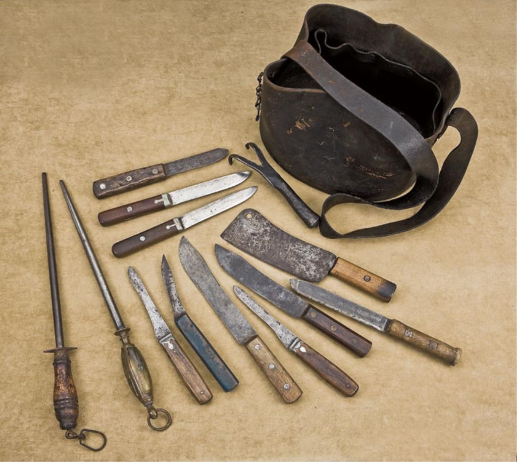 Buffalo Skinner’s set showing considerable age and use; included in this lot is a heavy copper riveted leather carry bag approx. 11” long by approx. 6” wide and approx. 8” in height with a leather shoulder strap in overall well-worn but good condition and with old copper riveted interior strips of leather than act as holder for the various skinning tools which include one wood handled and one horn handled sharpening rods, an “Absolute Trade Mark” cleaver with wood handle, four well-used pewter and wood handled knives, five additional cutting and carving knives, well-used and with iron blades and wood grips, a neat pair of hand forged clippers and a handmade iron two-prong skinning device. Est.: $750-$1,500.