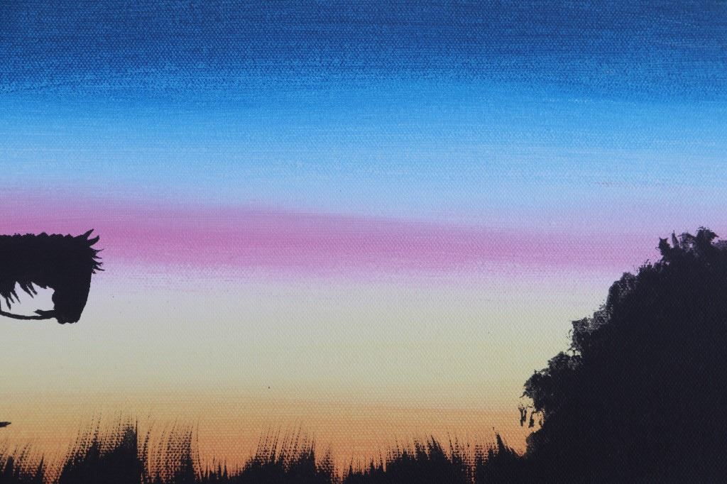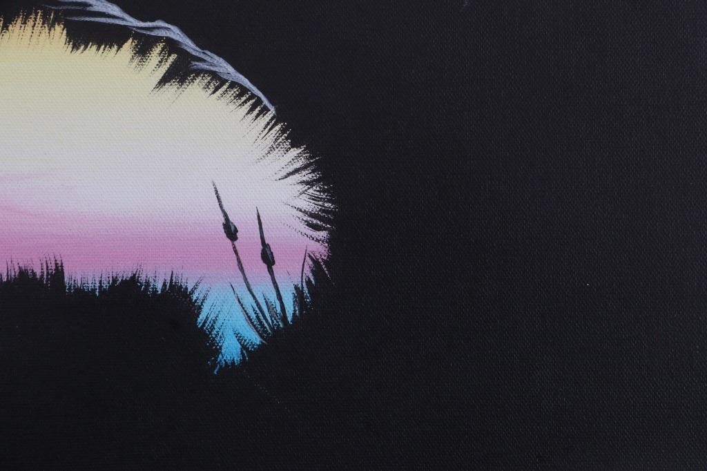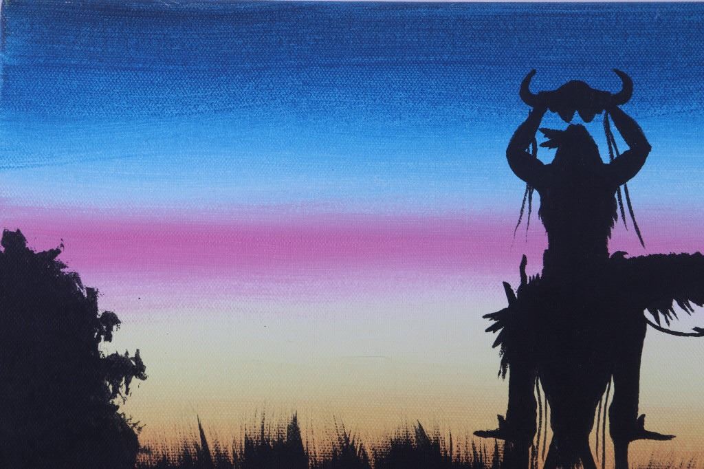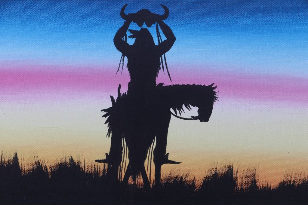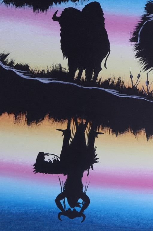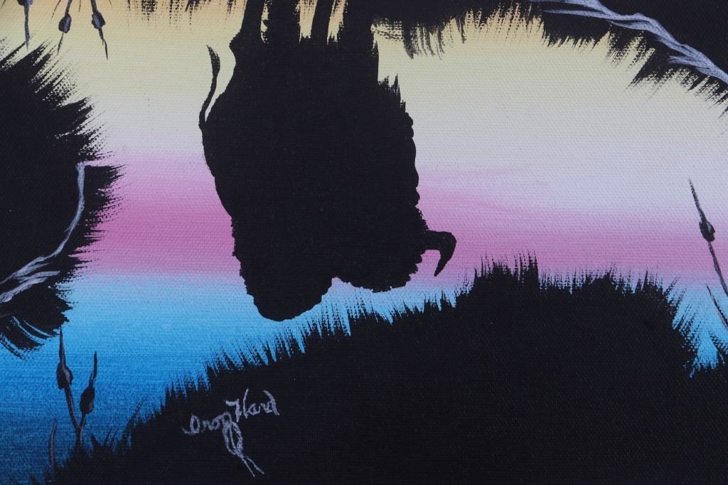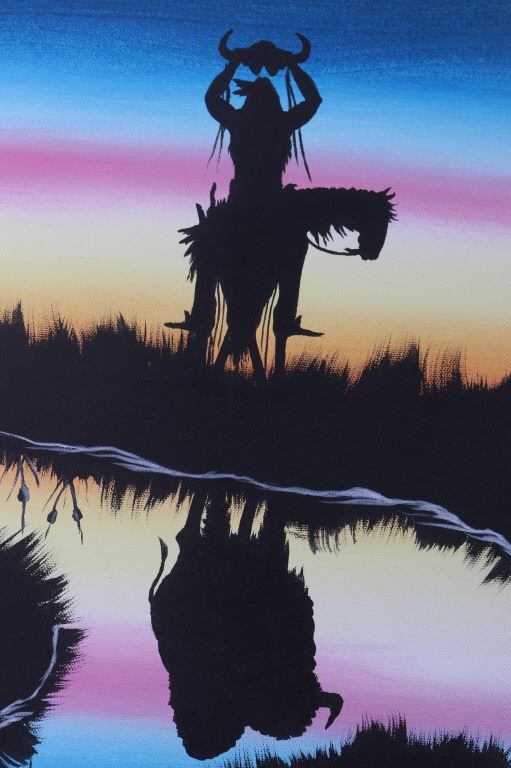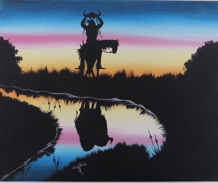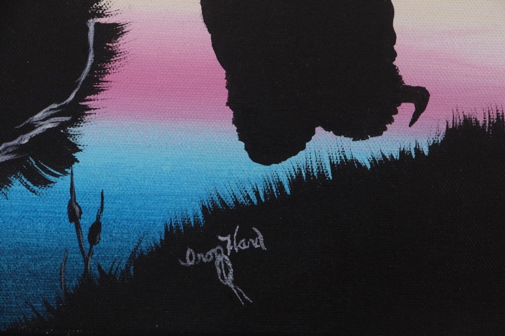 Featured in this lot is this acrylic on canvas of a buffalo spirit transformation by artist Iron Hand. The artwork features a beautiful sunset scene with a Native man mounted on a horse holding a ceremonial headdress above his head and seeing a reflection of a buffalo in the water in front of his, this is a shadow style of artwork with everything but the sky and the reflection blacked out. The artist signature can be seen just left of center at the bottom of the artwork. The International Artist known as Ironhand was born William Roy Swick on June 30, 1948 in Pendelton, Oregon. He is a third generation artist. Ironhand spent twenty-four years in the United States Army Special Forces Airborne (The Green Berets). His artwork embodies the spirit of his race and the love of what he does. Ironhand works in many media, hot glass, clay, graphite, oils, watercolors, bronze, wood, stone, the computer, and many others. The condition of this painting is good with no obvious signs of damage and in good overall condition. The measurements of this painting are 16" x 20".