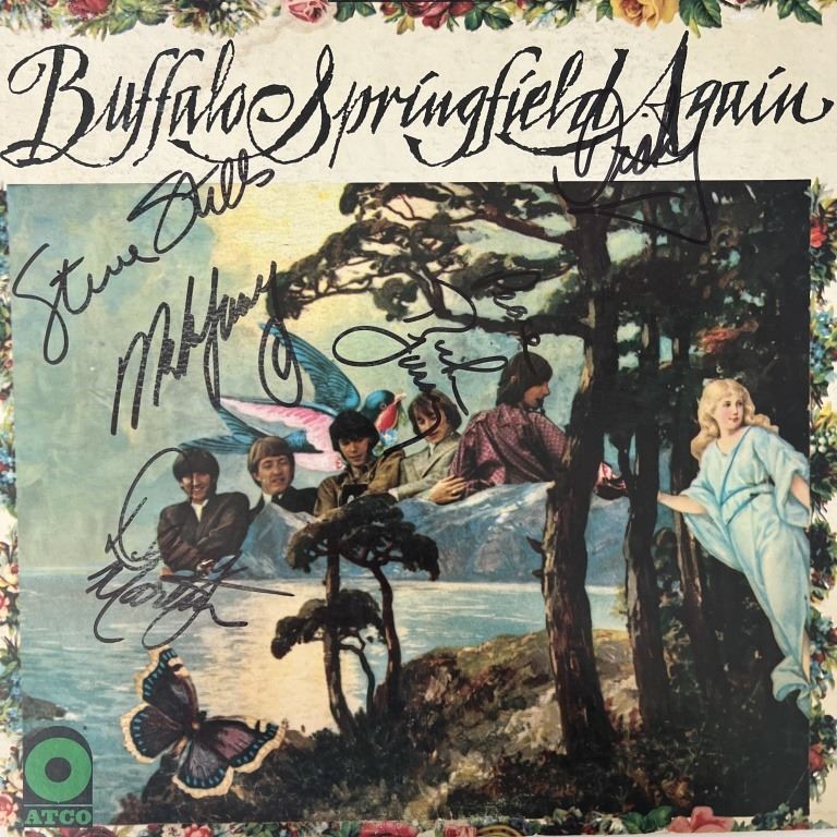 Buffalo Springfield Again signed album autographed by Neil Young, Stephen Stills, Richie Furay, and Dewey Martin. This item is also signed by Dicky Davis the bands manager and spirtual advisor. This is an unusual and rare lineup to have on a signed lp. 12x12 inches vinyl included. DB489