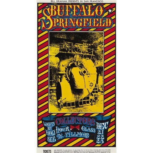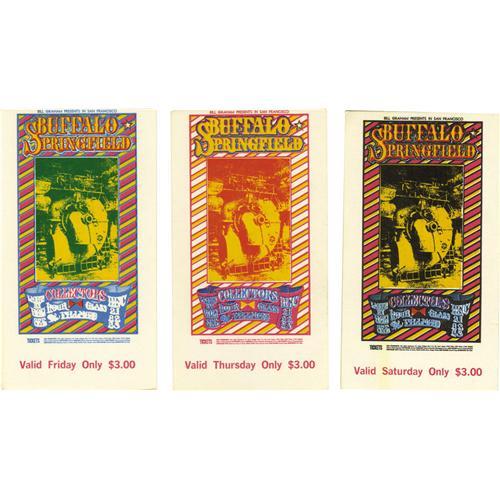 <B>Buffalo Springfield "Kelly" Fillmore Concert Poster BG-98 (Bill Graham Presents, 1967).</B></I> Buffalo Springfield was a true "supergroup", featuring such talented players as Neil Young, Steve Stills, and Richie Furray. Although known for only a couple of minor hits during their time ("For What It's Worth", "Bluebird"), their music is much admired today. Opening the show were the groups Hour Glass (featuring Duane Allman) and the Collectors. This poster, despite earlier beliefs, was only printed once; the three variations known were all done during the original press run. This is the version with "Kelly" scratched in the printing plate, appearing in the lower right area of the "boiler room" photo; it's a misspelling of artist Alton Kelley's name. The poster measures 11" x 21", and is in Near Mint condition. As an added bonus, this lot also includes a set of three tickets from the show, all of which are in Excellent condition.
