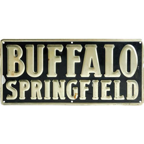 <B>Buffalo Springfield Steamroller Sign (1963).</B></I> The classic Los Angeles band, featuring Steven Stills, Neil Young, Ritchie Furay, Bruce Palmer, and Dewey Martin, originally got their name from a steamroller that was parked on the street outside record producer Bruce Friedman’s house (where Stills and Furay were staying at the time). This is an authentic Buffalo-Springfield Roller Company steamroller sign, like the one that inspired the name and the band's logo. It's made of pressed aluminum, painted in gold and black, and laminated; a small portion of paint and lamination has peeled away on the left side, and the raised letters have some light scuffing, staining, and very minor corrosion, but the overall condition is still an attractive Very Good. It's marked on the lower border area SCIOTO SIGN - KENTON, O, and hand-dated 1963. For what it's worth, this is a great, unusual item for fans of this wonderful band!<BR><BR><b>Shipping:</b> Flat Material, Small (<a target="_blank" href="http://www.heritageauctions.com/common/shipping.php">view shipping information</a>)