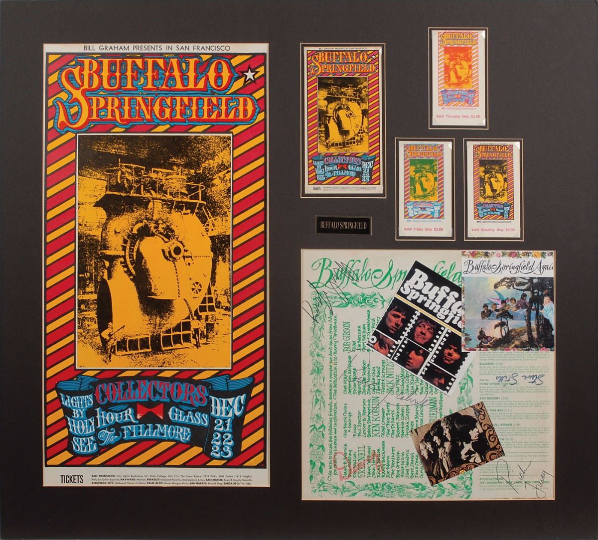 Buffalo Springfield Again album signed on the reverse in various inks with vintage period signatures by the full band: Neil Young, Stephen Stills, Richie Furay, Dewey Martin, and Bruce Palmer. Matted with three original tickets, a handbill, and a concert poster for their shows at the Fillmore in late December 1967 to an overall size of 29 x 26. In very good to fine condition, with three affixed Buffalo Springfield stickers. The record is not included. Pre-certified REAL.