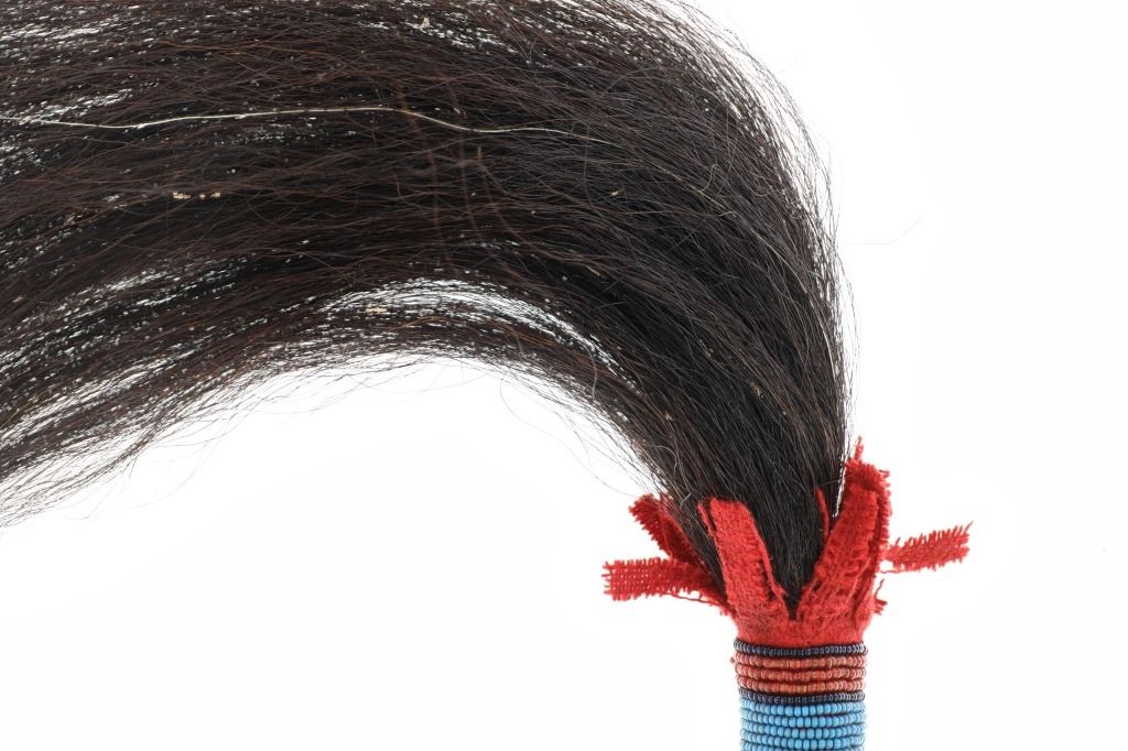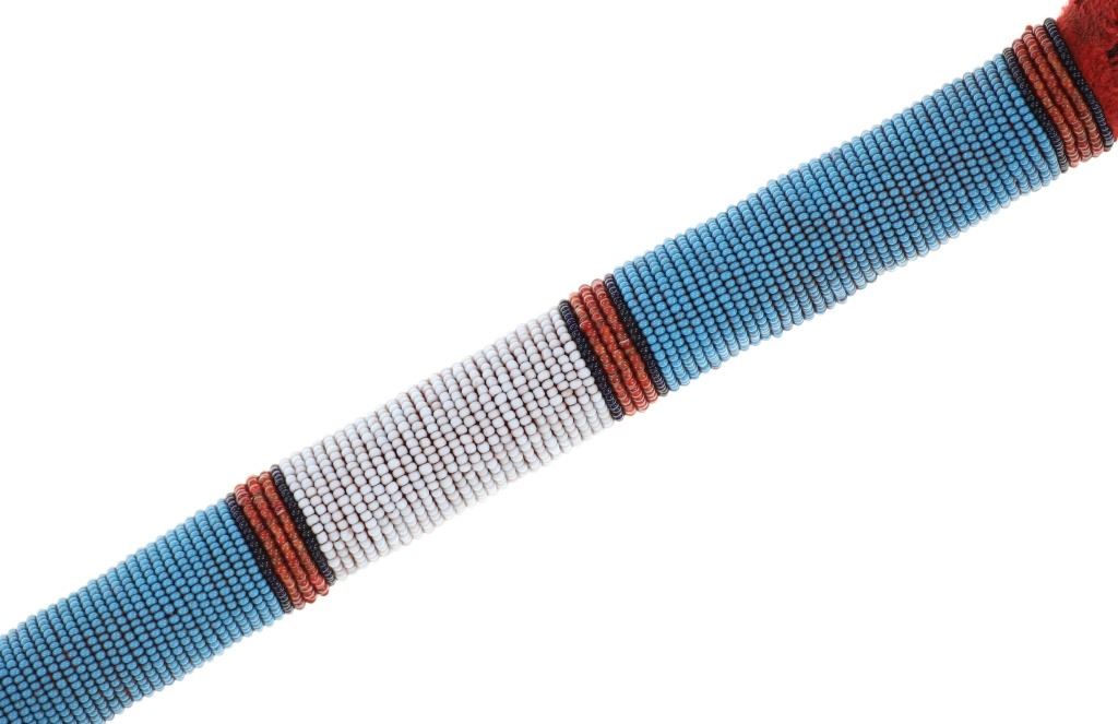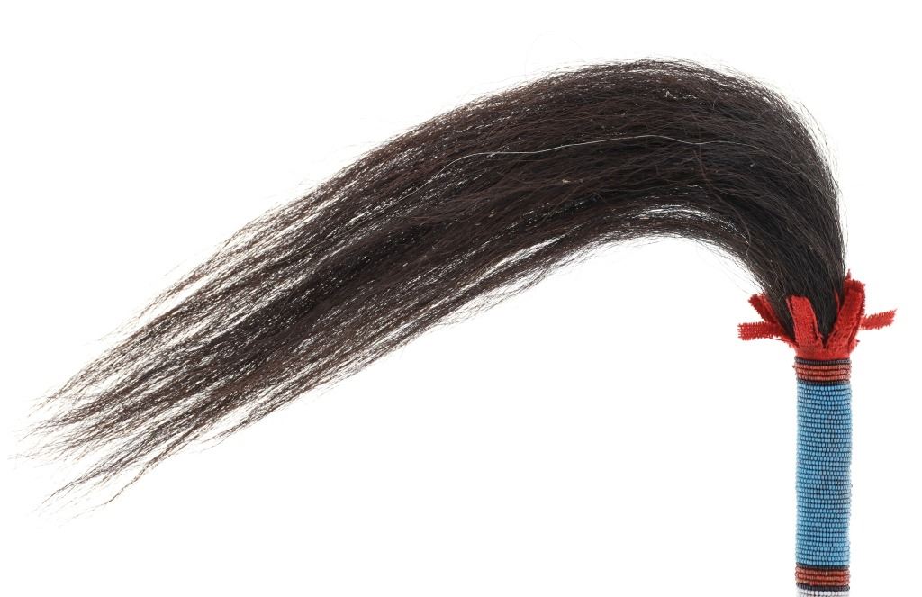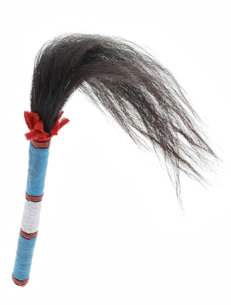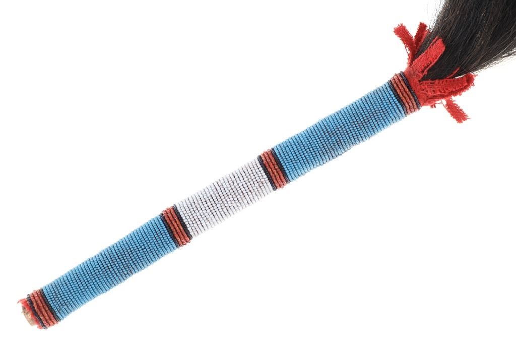 This is a unique piece, a sweat lodge or fly whisk covered in beadwork with the end being Buffalo tail hair. The piece exhibits a carved wood handle covered in Buffalo tail rawhide which is further covered in clothe and then has a banded glass trade seed bead design. The end shows red wool fringes with dark black Buffalo tail hair whisk. The beads are a greasy white, red white heart, cobalt and medium blue. Overall length 26"L with the handled being 9.5"L and about 1" diameter at the end.
