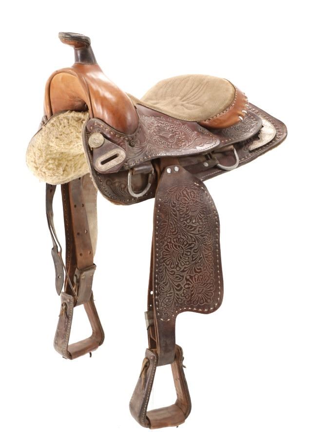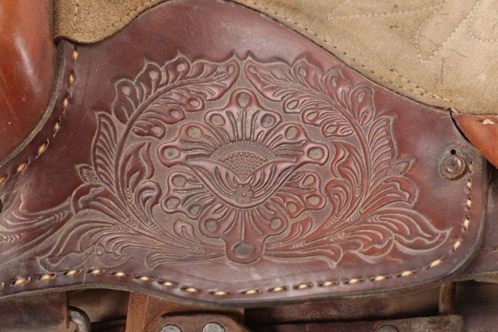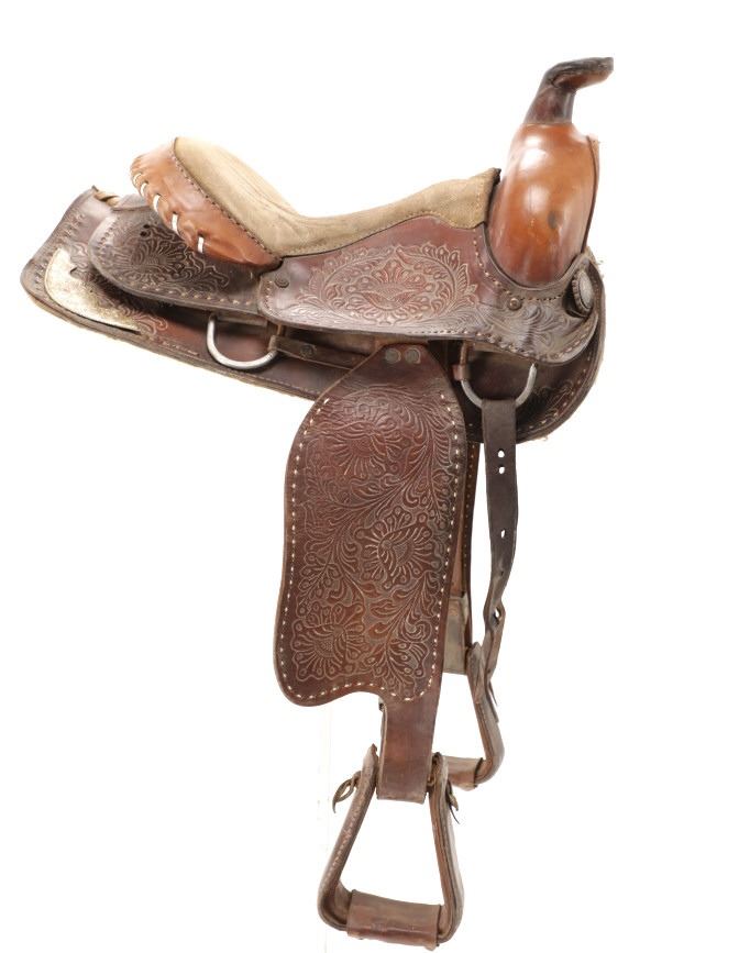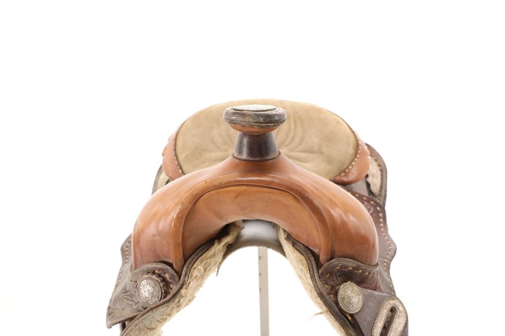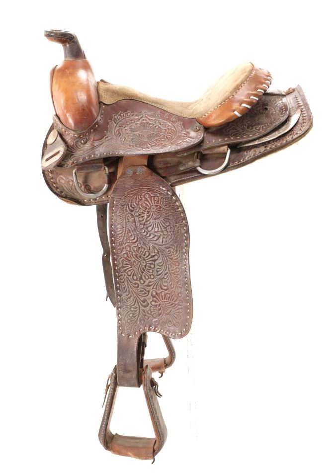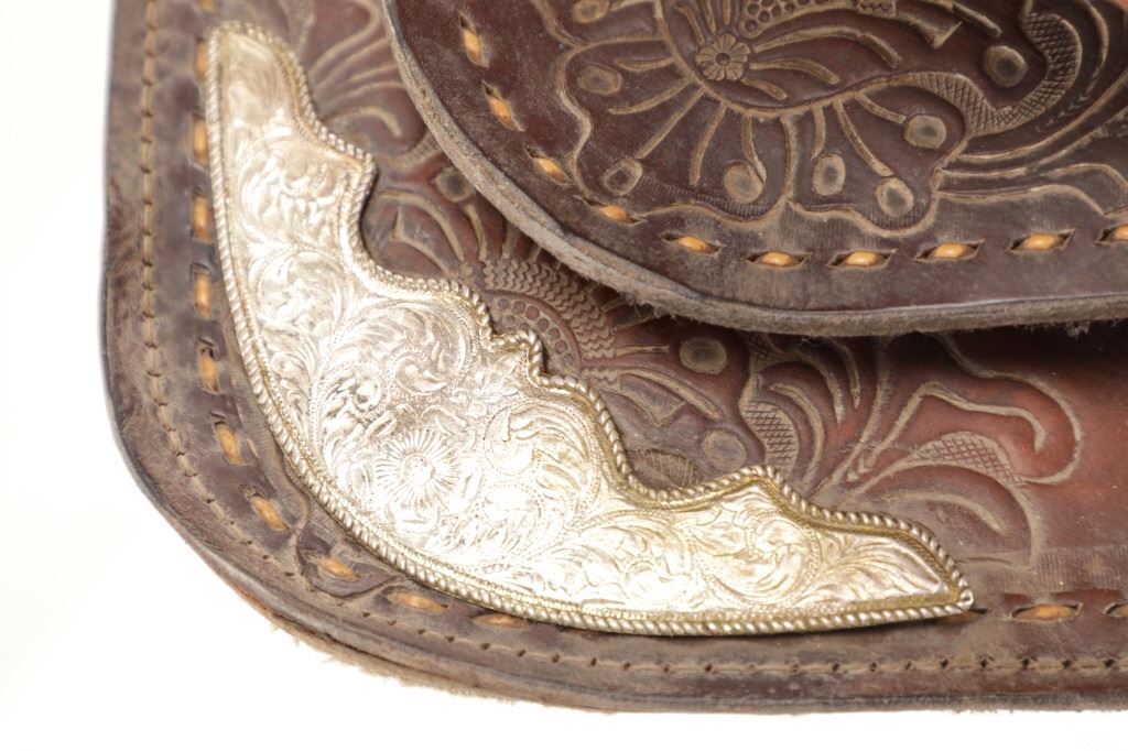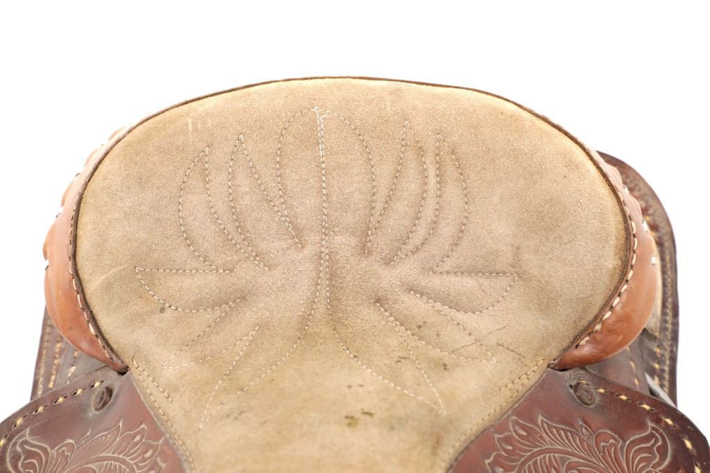 Featured in this lot is this tooled western leather Buffalo Cheyenne Roll saddle. The saddle features a wonderfully and professionally crafted leather and nickel silver construction. The saddle shows beautiful tooling to the seat jockey, fenders, and skirt with adornments of nickel silver to the latigo keeper and the corner of the skirt. The condition of this western show saddle is good with no obvious signs of damage and shows good overall condition. The measurements of this saddle is 40" x 24 1/2" x 14". The seat size is 14".