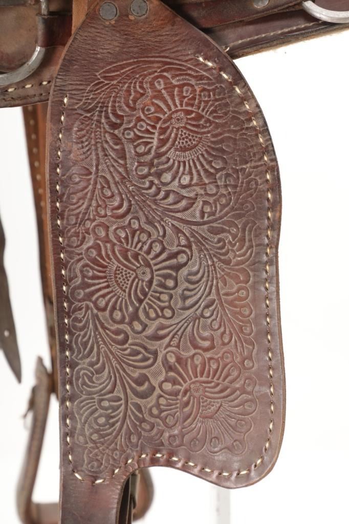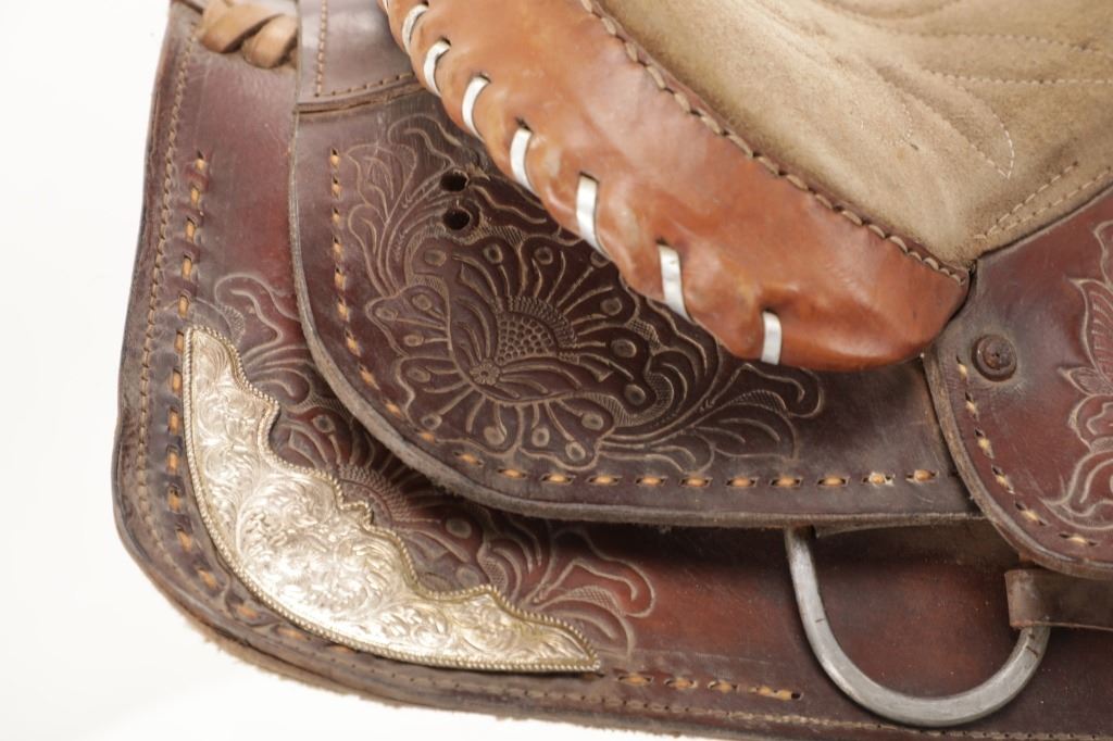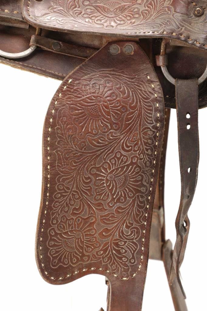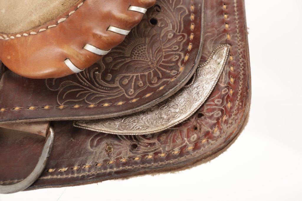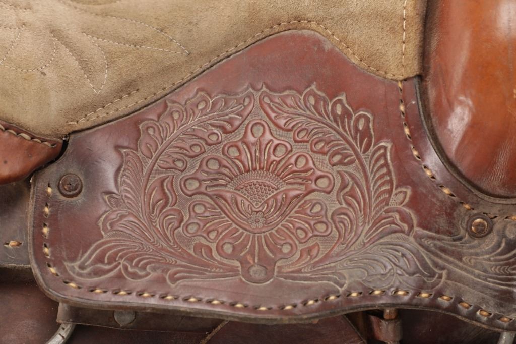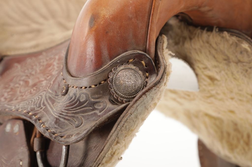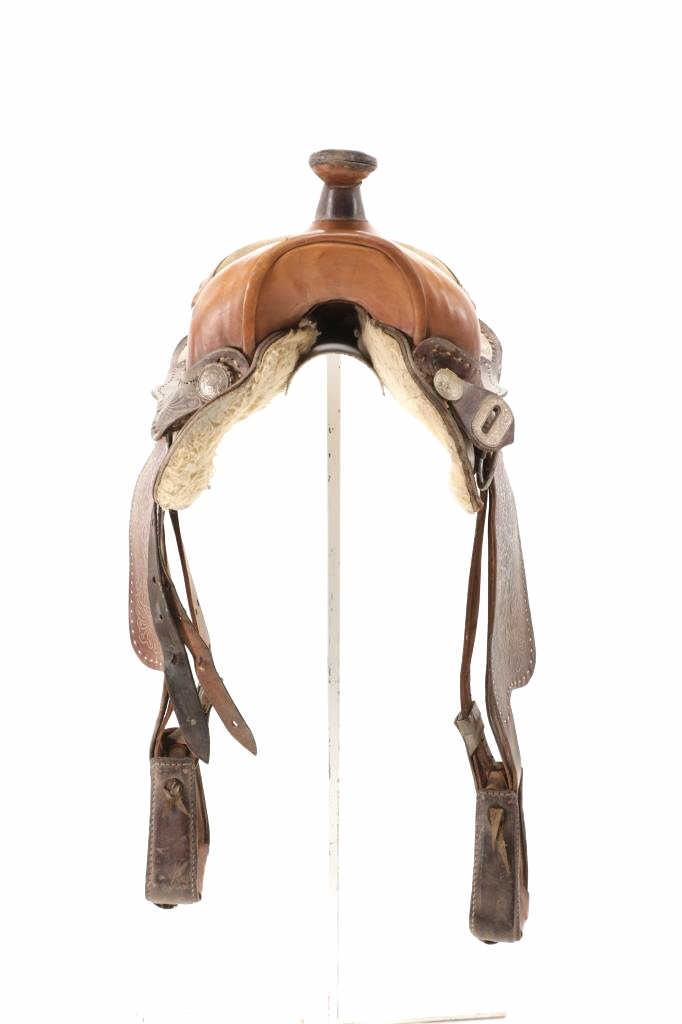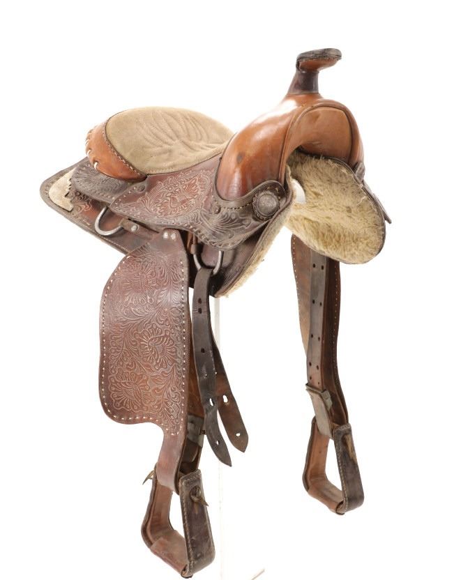 Featured in this lot is this tooled western leather Buffalo Cheyenne Roll saddle. The saddle features a wonderfully and professionally crafted leather and nickel silver construction. The saddle shows beautiful tooling to the seat jockey, fenders, and skirt with adornments of nickel silver to the latigo keeper and the corner of the skirt. The condition of this western show saddle is good with no obvious signs of damage and shows good overall condition. The measurements of this saddle is 40" x 24 1/2" x 14". The seat size is 14".
