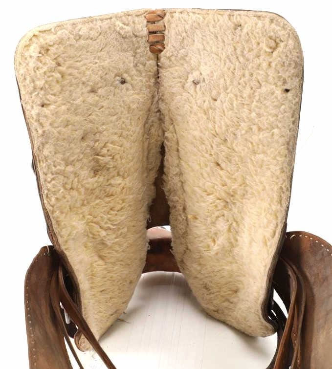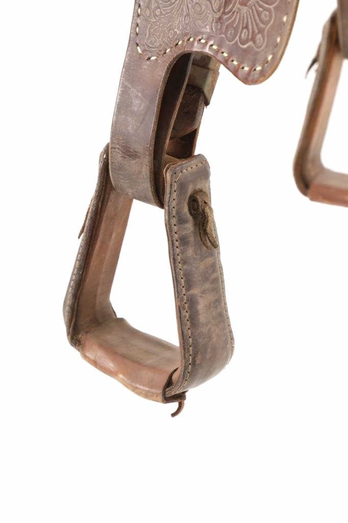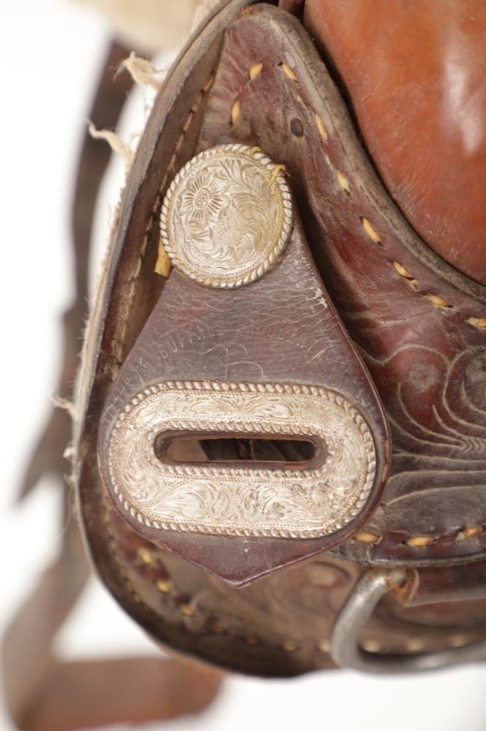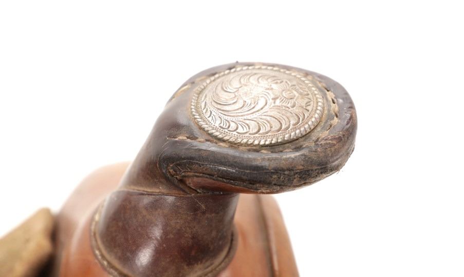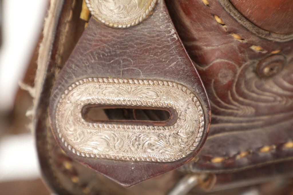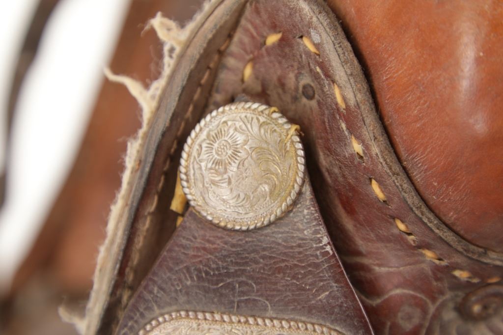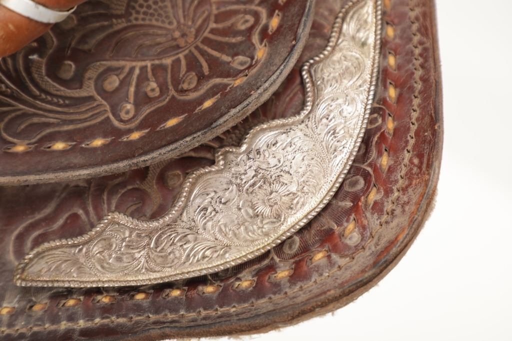 Featured in this lot is this tooled western leather Buffalo Cheyenne Roll saddle. The saddle features a wonderfully and professionally crafted leather and nickel silver construction. The saddle shows beautiful tooling to the seat jockey, fenders, and skirt with adornments of nickel silver to the latigo keeper and the corner of the skirt. The condition of this western show saddle is good with no obvious signs of damage and shows good overall condition. The measurements of this saddle is 40" x 24 1/2" x 14". The seat size is 14".