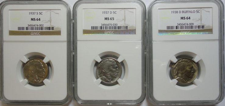 Buffalo nickels slabbed NGC ;37D MS65-37S MS64-38D MS64