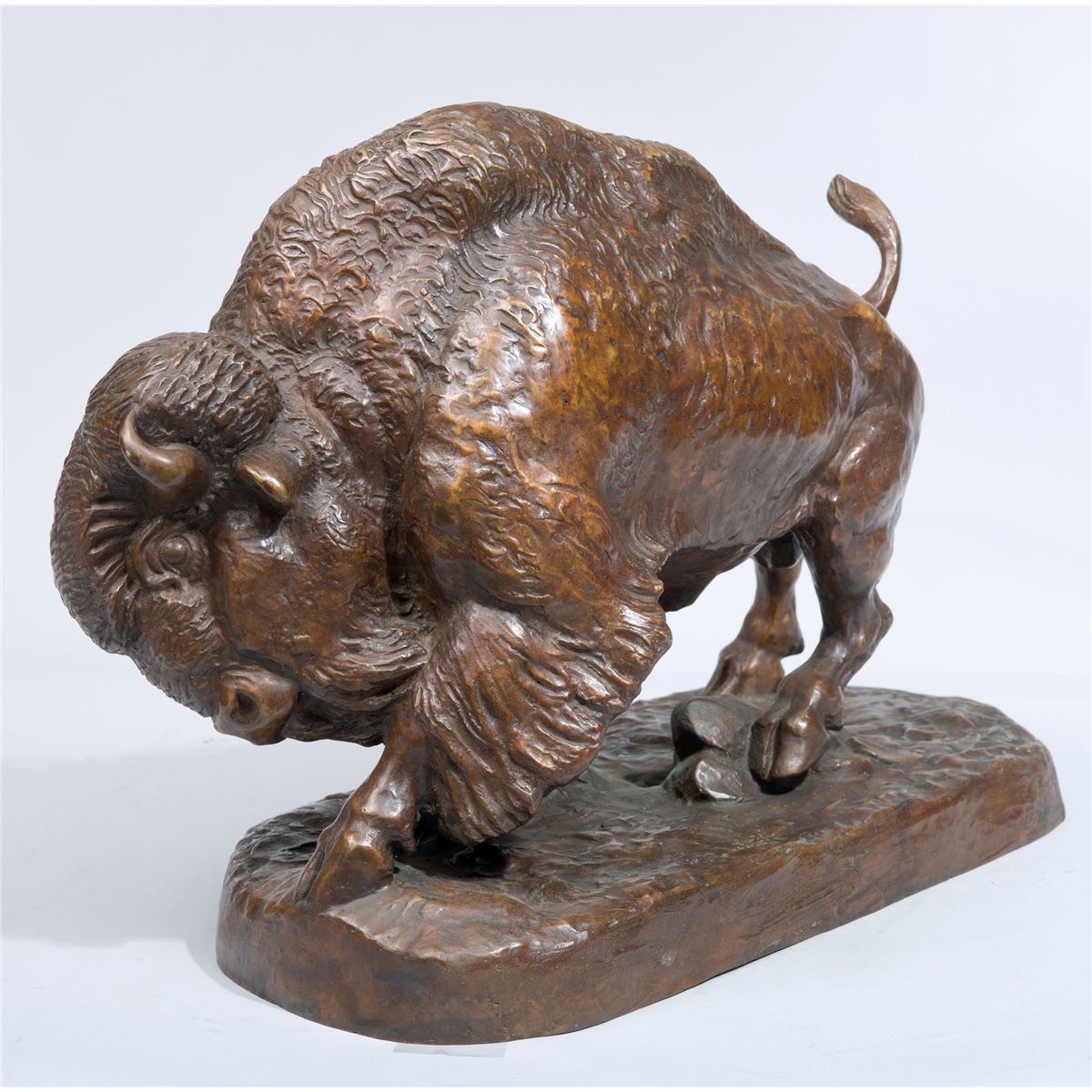 Buffalo was cast in 1956 by the famous Bedi-Makky Foundry in Brooklyn (they cast the Raising of the Flag at Iwo Jima, and countless other historic monumental bronzes) at the behest of Ethel Traphagen, Leigh’s widow, just prior to the “90th Anniversary Roundup” listed above. Leigh made the original clay model as a three-dimensional preliminary study for his 1947 masterpiece, Buffalo Hunt, which was the color cover of the “Roundup” brochure and now hangs in the permanent collection of The Rockwell Museum in Corning, New York. Many artists, particularly those, like Leigh, Thomas Hart Benton, and others who worked in museums and murals, made three- dimensional models of the figures and animals they wanted to incorporate into larger works. Doing so allowed them to understand mass, point of view, and shadow, to give those elements weight and movement and a sense of proportion and correct perspective. In both two and three dimensions, Leigh’s Buffalo, charging with his head down, presents challenges to the artist. We have to see under, over, and around the animal, though there is little air to accommodate this. In the painting, Leigh lights the buffalo from below and from the back, and this gives him just enough outline to mitigate against the dust raised in the chase. It’s an elegant solution to a potentially difficult problem, solved in part by the model that became, in itself, a work of art.