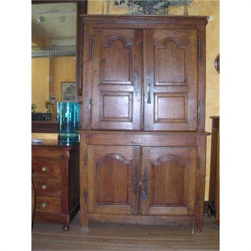 Wonderful French country buffet a deux corps in pear and cherry wood from the Sarthe region of France. This charming buffet has lots of character and still has all the original hardware. This authentic buffet a deux corps has some imperfections which give it the rustic, country feel. It is unusually small for this type of kitchen buffet. I would be happy to send more detailed photos if requested.