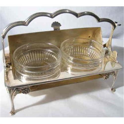 Breakfast Buffets!!?? Lunch Buffets!!?? Not the original little glass bowls but they fit! To hold Jam, Marmalade, Relish, Pickle, Horseradish etc. There is a place at one end to suspend a fork or spoon. Needs a proper clean. Normal wear. No loss to plate.