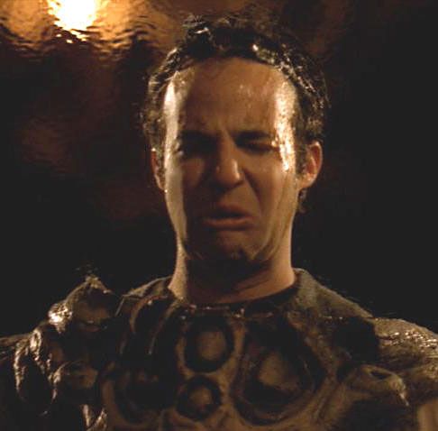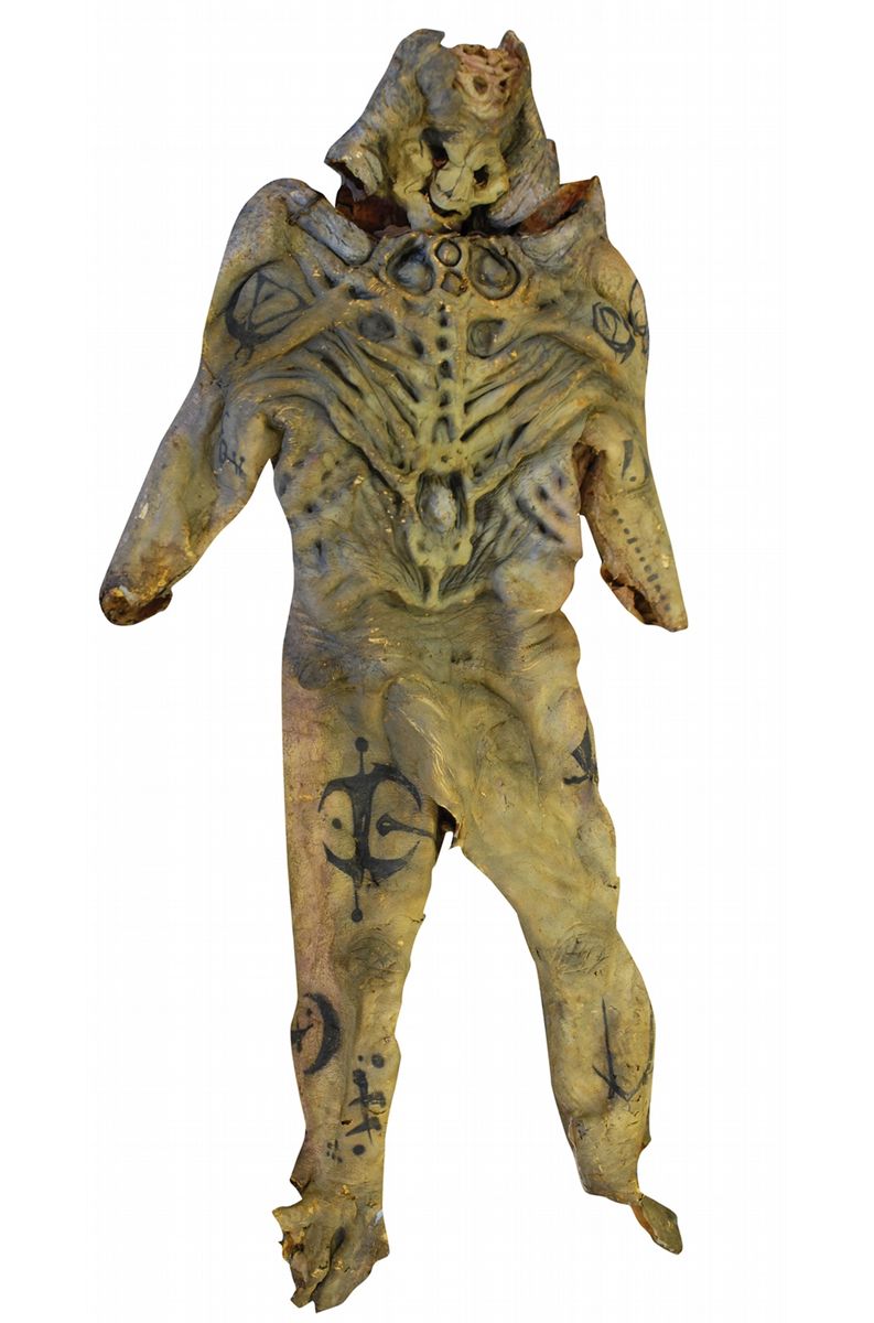 Screen-worn costume of a Nezla Demon worn by Danny Strong as Jonathan in the season six episode of Buffy–The Vampire Slayer entitled Seeing Red. Full-size latex foam rubber demon ‘skin’ complete with face and simulated innards. The demon was skinned by Strong’s character to be worn and move around undetected amongst the other demons. Several small tears, scattered surface loss, and expected wear, otherwise fine condition.