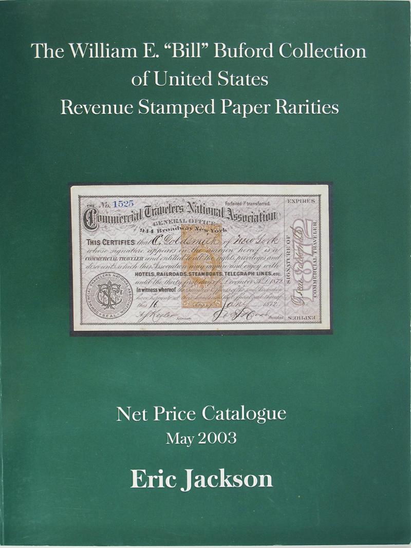 Catalogue compiled by Jackson, Eric. Soft cover, 104 pages, dated May, 2003. Filled with color photographs of various revenue stamped papers. Also includes Stamp Collector article highlighting several unique pieces from August 25, 2003.