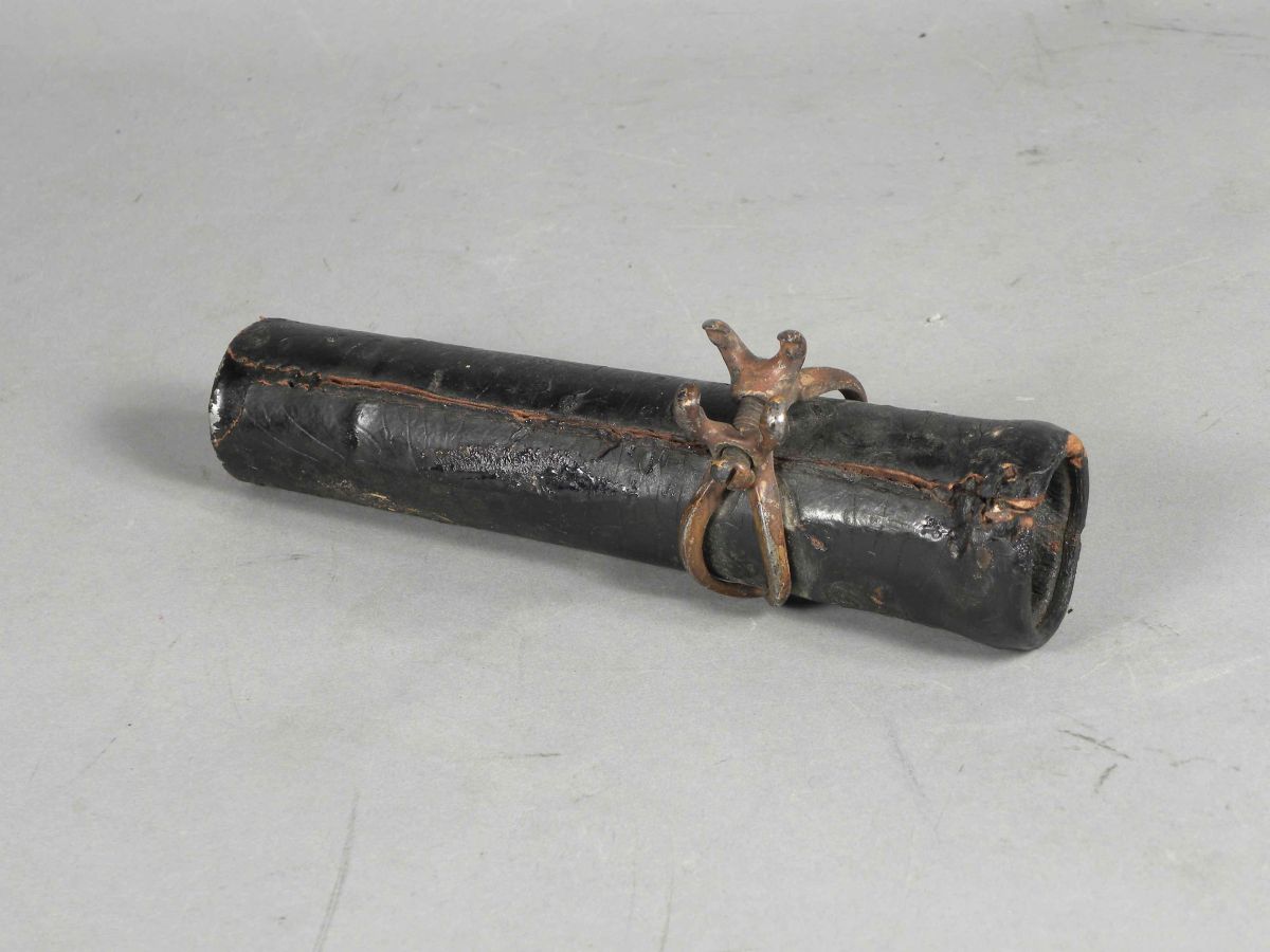 Buggy Whip w/leather buggy whip holder. Whip is "Thunderbolt Rawhide" Sterling Whip Co., Westfield, Mass. Silver plated brass trim. Original paper label, good condition.