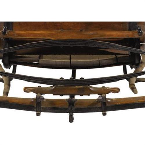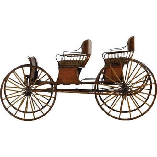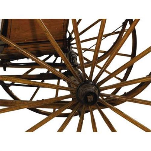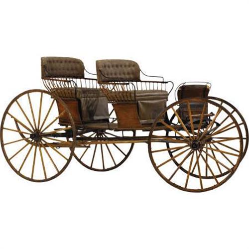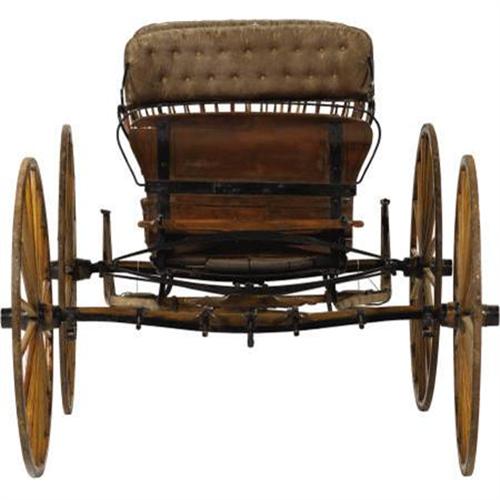 <B>BUGGY WITH TWO SPINDLE SEATED BUCKBOARD WITH SHAFTS CIRCA 1890 - EARLY 1900's</B></I> - Has natural wood finish that has been refinished and sealed. The seat backs (buttoned down upholstery) are the original leather in weathered condition; however, the bottom seat cushions have been replaced. There are springs for suspension in front but no breaking mechanism due to the light weight of the vehicle. The dashboard has been repaired in service, with a whip holder and there are also all four metal steps for accessibility. This was the Cadillac of buggies; to drive in to town for groceries and social events. Dimensions; rear wheels: 44 ½", front wheels: 40 ½", overall 9' 9", platform 5' 9".<BR><BR><B>Condition:</B></I> Good to Very Good.<BR><BR><b>Shipping:</b> Requires 3rd Party Shipping (<a target="_blank" href="http://www.heritageauctions.com/common/shipping.php">view shipping information</a>)
