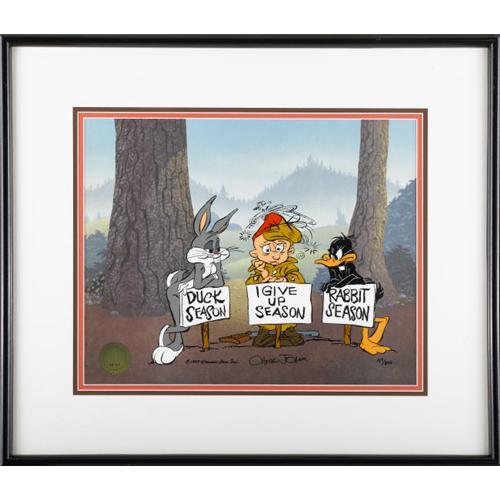<B>Bugs Bunny, Elmer Fudd, and Daffy Duck "Duck Season" Limited Edition Hand Painted Cel #127/500 Original Art (Warner Bros.,1993).</B></I> Hand painted cel of a Chuck Jones scene from the celebrated "Duck Season," authenticated by Linda Jones Ent., Inc. Image area of 15.5" x 12.5". Framed and in Excellent condition.