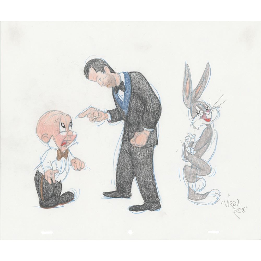 (Warner Brothers Studios, 1990s) Original drawing by Virgil Ross of Bugs Bunny, Humphrey Bogart, and Elmer Fudd, which shows the famed actor scolding Fudd while Bugs strolls away with a grin, a scene inspired by the 1947 Merrie Melodies cartoon Slick Hare. Accomplished in graphite and colored pencil on untrimmed 12.5 x 10.5 animation paper, signed at the bottom in pencil, "Virgil Ross." In fine condition. This one-of-a-kind drawing was done to be sold in the Warner Brothers Studio stores in the 1990s.