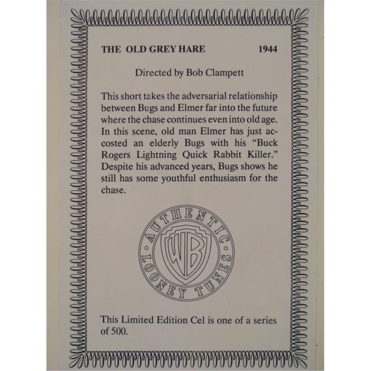 Here is a limited edition animation cel taken from a 1944 short directed by Bob Clampett, titledThe Old Grey Hare. This scene is a dramatic encounter between an elder Bugs and Elmer, sometime in the future when hunting for "wabbits" still goes on. * Medium: Serigraph celImage size: 11 3/4 x 9 1/4 inchesEdition: 384/500, marked lower rightDetails: Warner Bros printed gold seal, lower leftPresentation: Double matted in black and whiteMatte size: 18 x 14 inchesCondition: Excellent; sealed in cellophaneCertification: Included