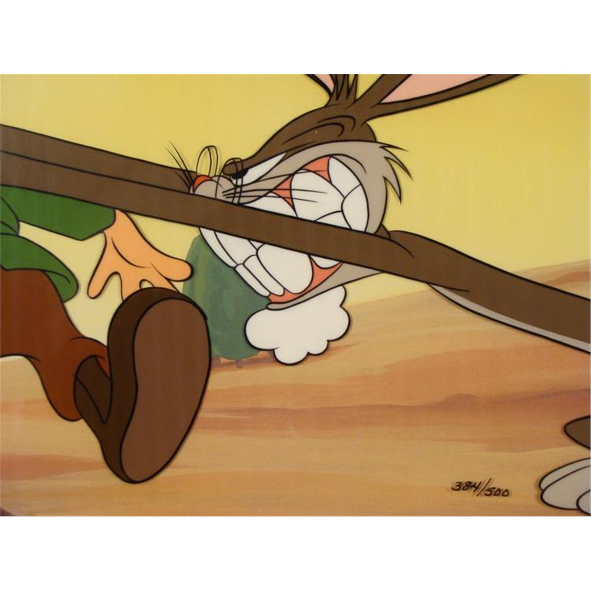 Here is a limited edition animation cel taken from a 1944 short directed by Bob Clampett, titledThe Old Grey Hare. This scene is a dramatic encounter between an elder Bugs and Elmer, sometime in the future when hunting for "wabbits" still goes on. * Medium: Serigraph celImage size: 11 3/4 x 9 1/4 inchesEdition: 384/500, marked lower rightDetails: Warner Bros printed gold seal, lower leftPresentation: Double matted in black and whiteMatte size: 18 x 14 inchesCondition: Excellent; sealed in cellophaneCertification: Included