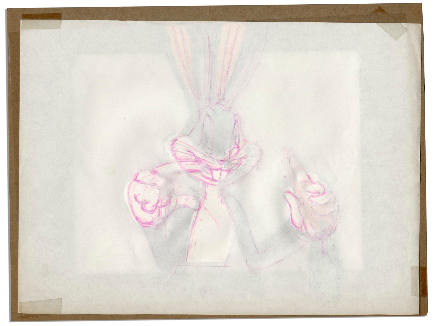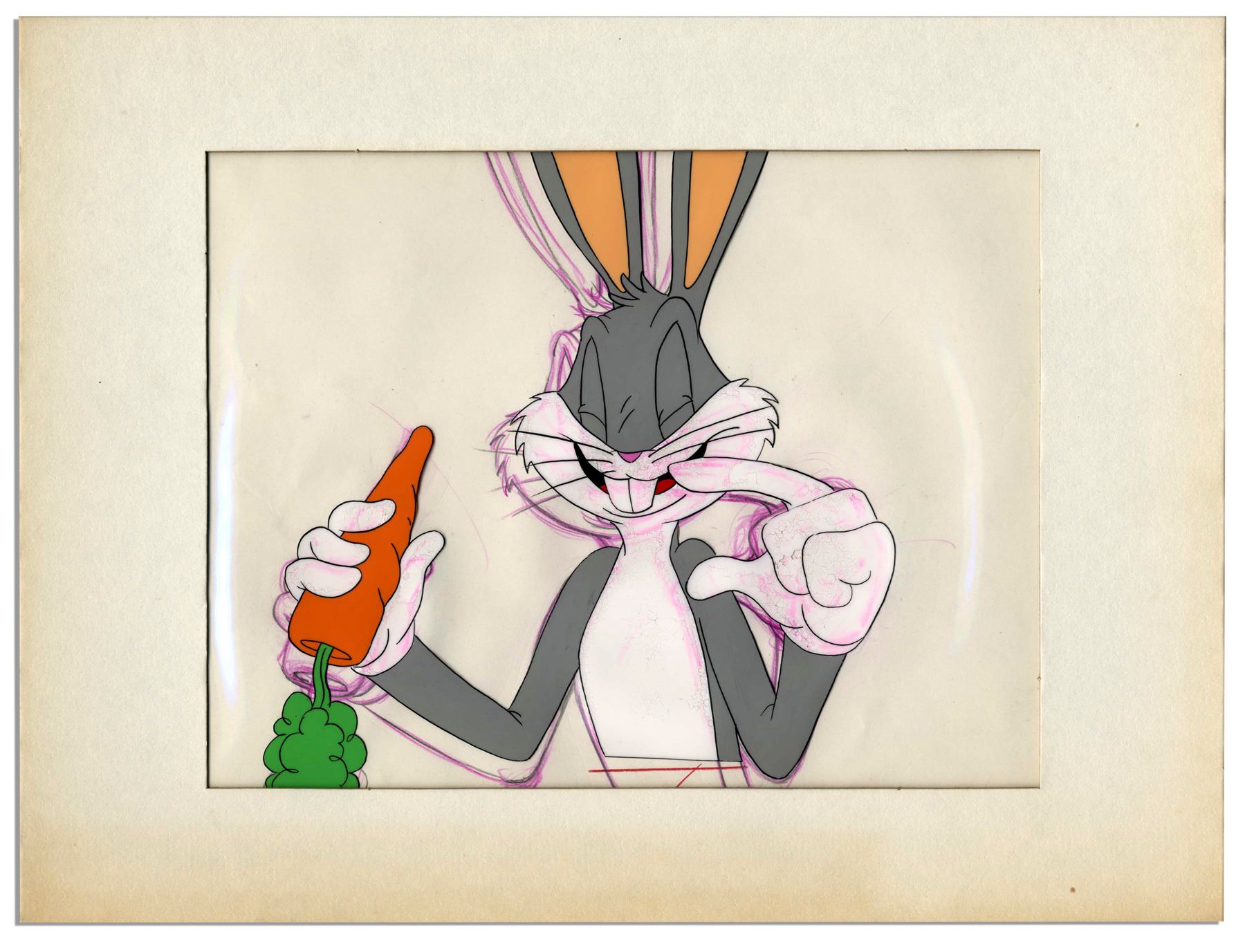 Ray Bradbury personally owned Bugs Bunny animation cel by Warner Bros. Bugs grins with shut eyes, his everpresent carrot in his right hand. Cel is matted on top of a matching sketch in pencil and fuchsia colored pencil. Measures 12.5'' x 9.25''. Cel shows cracking, chipping and transfer of pink in some places from the sketch, overall very good. With a COA from the Ray Bradbury estate.