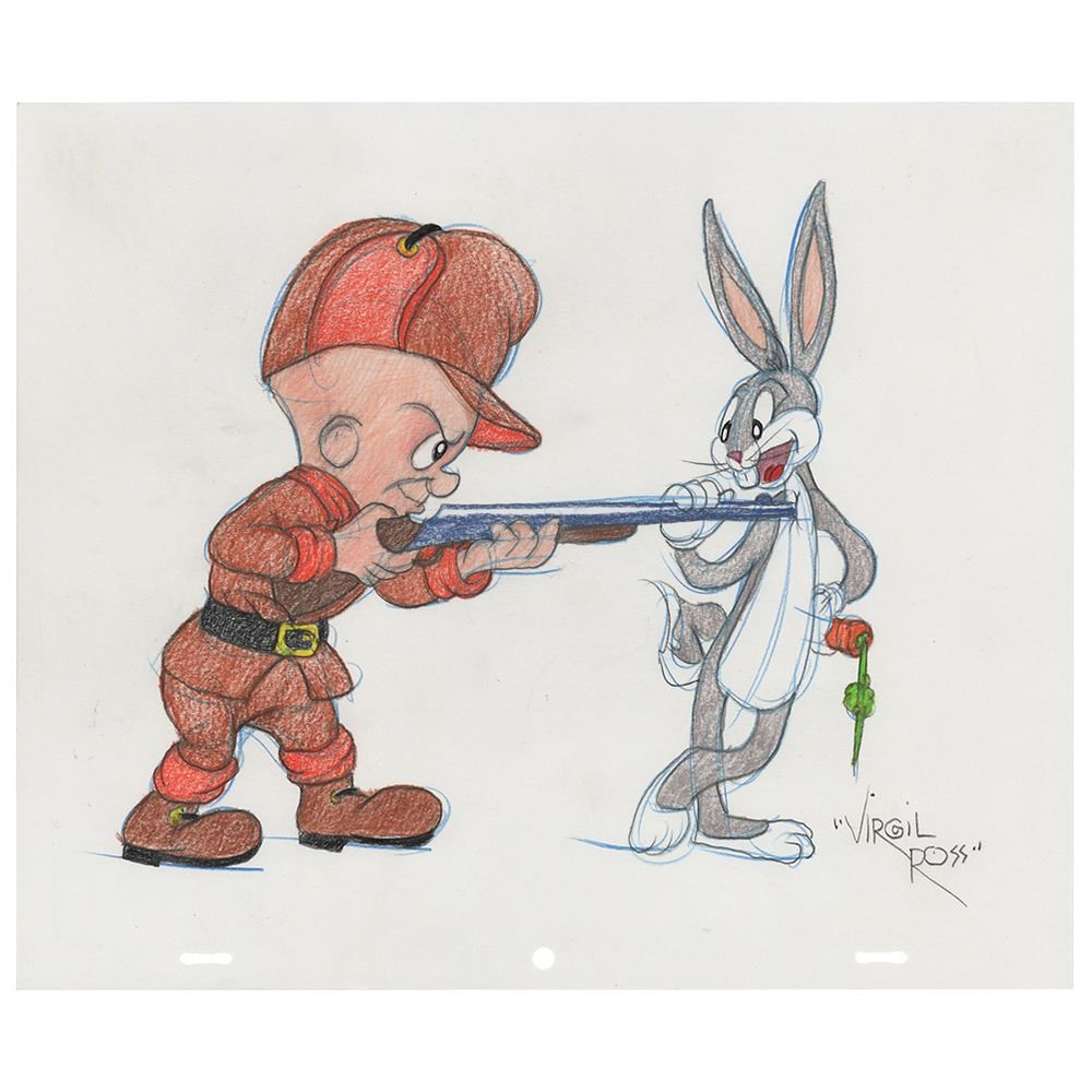 (Warner Brothers Studios, 1990s) Original drawing by Virgil Ross featuring Bugs Bunny and Elmer Fudd, showing Elmer threatening Bugs with his rifle. Accomplished in graphite and colored pencil on untrimmed 12.5 x 10.5 animation paper, signed at the bottom in pencil, "Virgil Ross." In fine condition. This one-of-a-kind drawing was done to be sold in the Warner Brothers Studio stores in the 1990s.