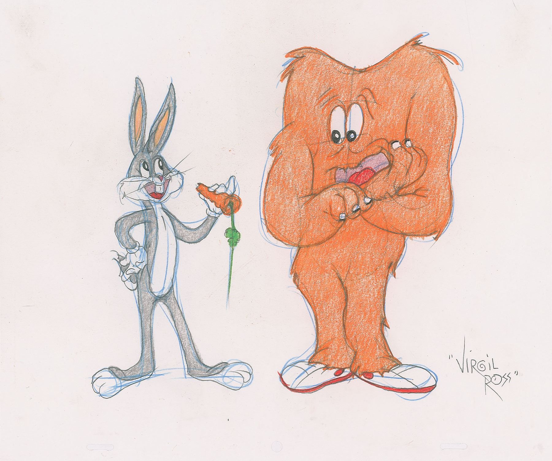 (Warner Brothers Studios, 1990s) Original drawing by Virgil Ross of Bugs Bunny eating a carrot next to the orange monster Gossamer. Accomplished in graphite and colored pencil on untrimmed 12.5 x 10.5 animation paper, signed at the bottom in pencil, "Virgil Ross." In fine condition. This one-of-a-kind drawing was done to be sold in the Warner Brothers Studio stores in the 1990s.