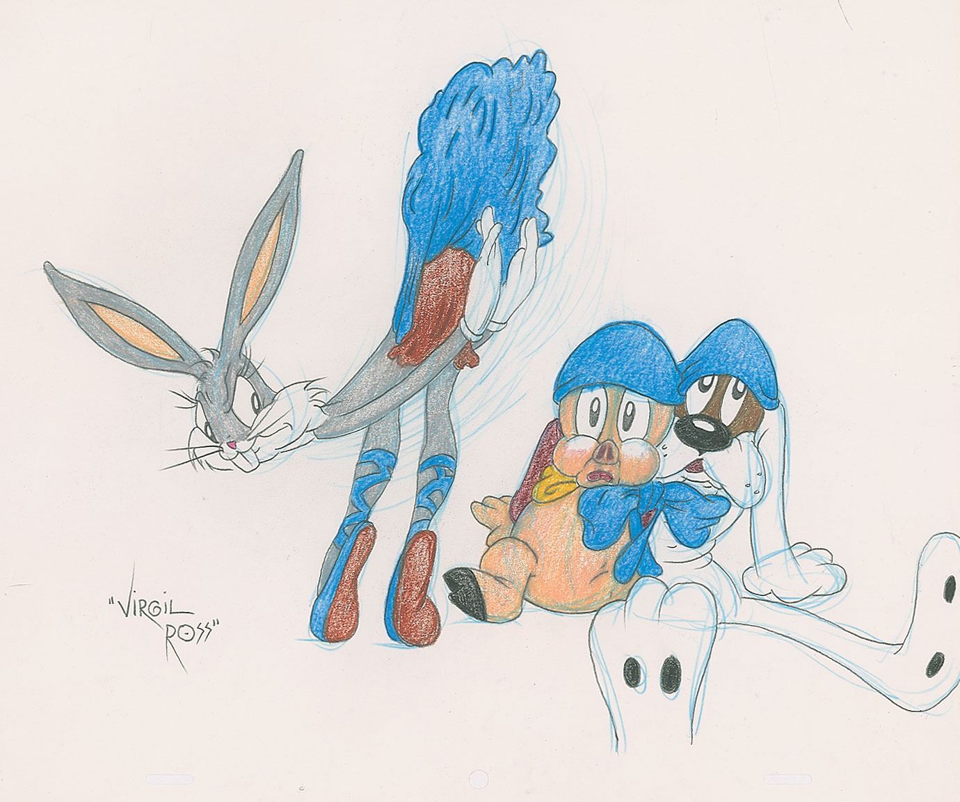(Warner Brothers Studios, 1990s) Original drawing by Virgil Ross featuring Bugs Bunny and Porky Pig, showing Bugs humorously dressed as a ballerina. Accomplished in graphite and colored pencil on untrimmed 12.5 x 10.5 animation paper, signed in the lower left in pencil, "Virgil Ross." In fine condition.