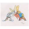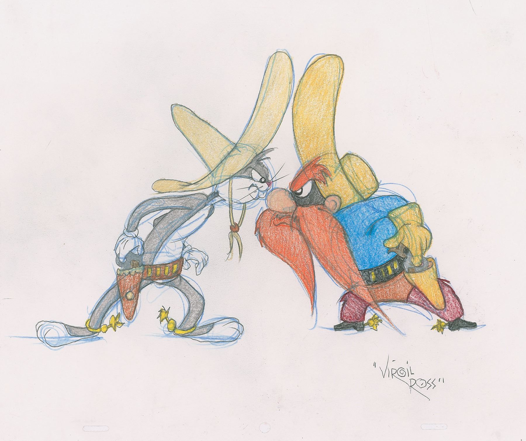 (Warner Brothers Studios, 1990s) Original drawing by Virgil Ross of Bugs Bunny and Yosemite Sam preparing for a duel, a scene strikingly similar to how they appeared in the 1948 cartoon, Bugs Bunny Rides Again. Accomplished in graphite and colored pencil on untrimmed 12.5 x 10.5 animation paper, signed at the bottom in pencil, "Virgil Ross." In fine condition. This one-of-a-kind drawing was done to be sold in the Warner Brothers Studio stores in the 1990s.