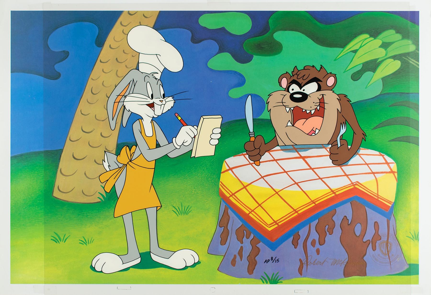 (Warner Brothers Studios, 1992) Original limited edition hand-painted artist's proof cel entitled 'Supper Time,' numbered AP 8/15, featuring Bugs Bunny and the Tasmanian Devil. The cel is placed on a color Warner Bros. litho background, with overall dimensions of 19.5 x 13.5. The piece has a facsimile signature of Robert McKimson and gold Warner Bros. seal to lower right. In fine condition. Accompanied by a certificate of authenticity from McKimson Productions.