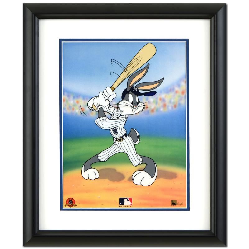 "Bugs Bunny at Bat for the Yankees" is a limited edition sericel with a vivid full-color background by Looney Tunes, marked with the MLB logo and the Yankees Logo! This piece comes framed. Includes Certificate of Authenticity! Measures approx. 16" x 19" (frame), 9.5" x 13.5" (image).