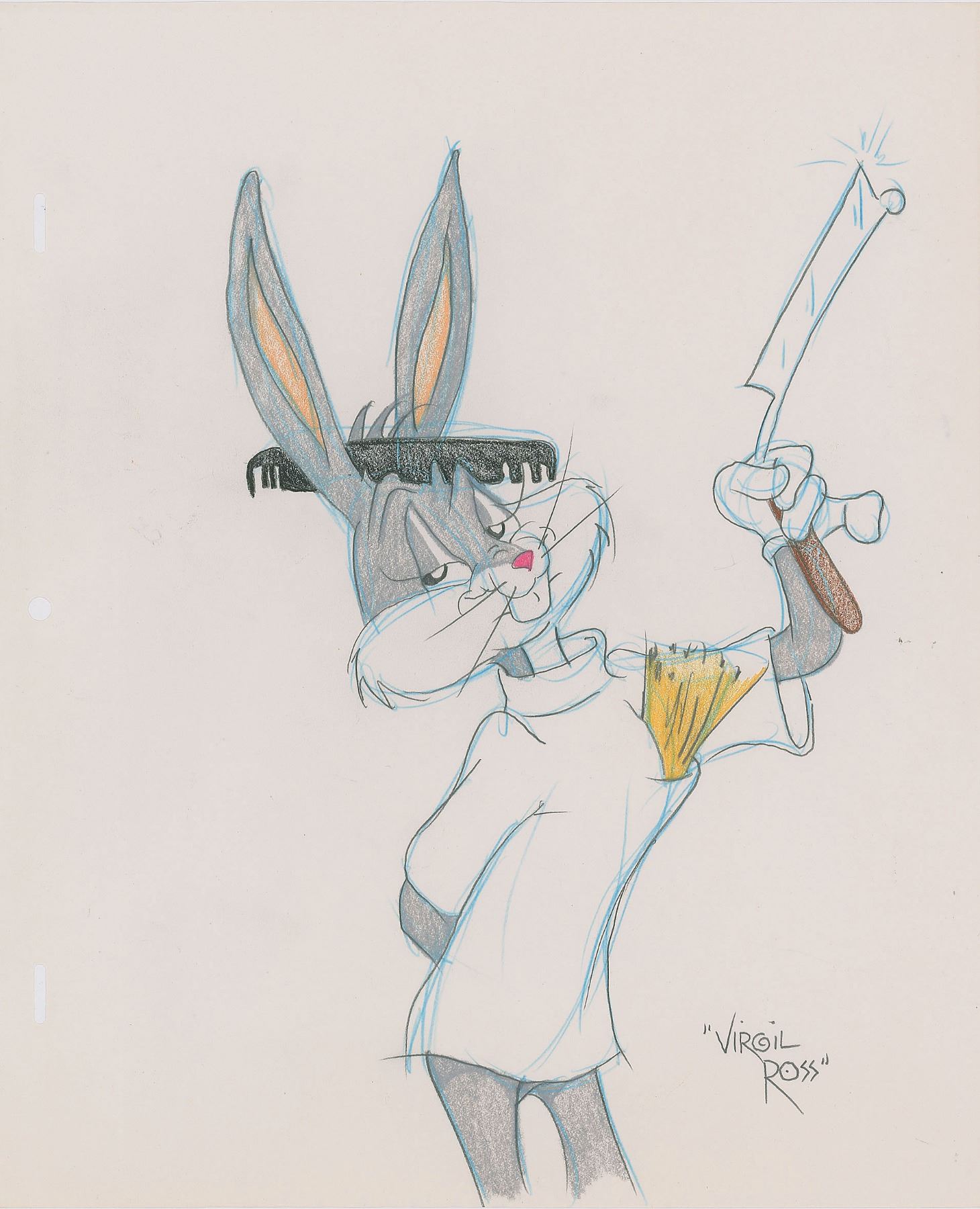 (Warner Brothers Studios, circa 1980s) Original publicity drawing of Bugs Bunny by Virgil Ross, showing the rabbit with comb and straight-edge razor, based on the cartoon Rabbit of Seville, signed below in pencil by Ross. Accomplished in graphite and colored pencil on untrimmed 10.5 x 12.5 animation paper. Image measures 7 x 11. In fine condition.