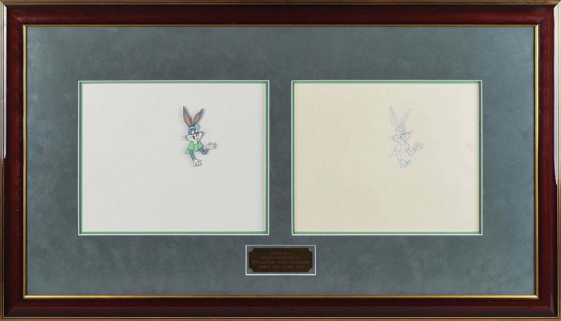 (Warner Brothers Studios, 1979) Original production cel and matching production drawing featuring Bugs Bunny from Bugs Bunny's Thanksgiving Diet, showing him as 'Diet Doctor Bugs Bunny.' Character images measure 2.25 x 3.5, with mat openings of 11 x 9. Framed side-by-side to an overall size of 35 x 20. In fine condition. Bugs Bunny's Thanksgiving Diet was a thirty-minute animated television special released on November 15, 1979.