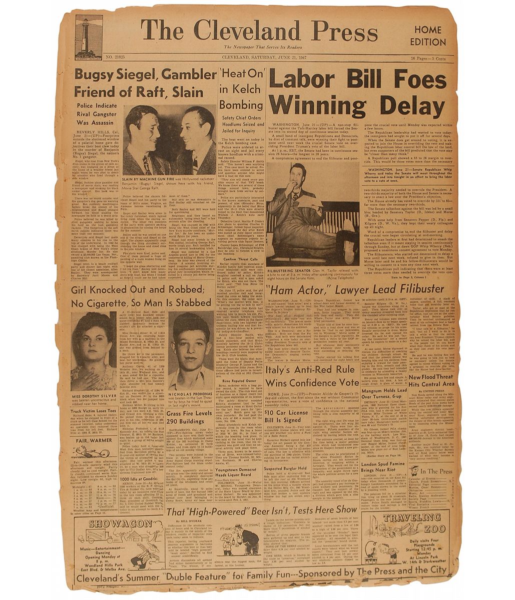 Original June 21, 1947, home edition of the Cleveland Press, 16 x 23, 14 pages. Headline in upper left states “Bugsey Siegel, Gambler Friend of Raft, Slain, Police Indicate Rival Gangster Was Assassin.” Article also has a photo of Siegel and Raft together. Central horizontal fold, uniform toning, a couple creases, and scattered paper loss and tears to edges, otherwise very good condition.