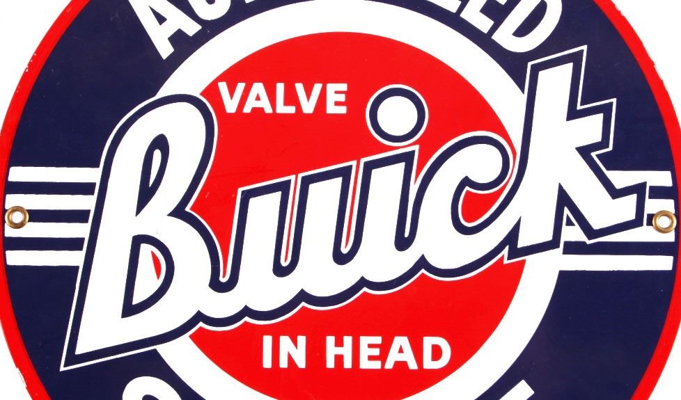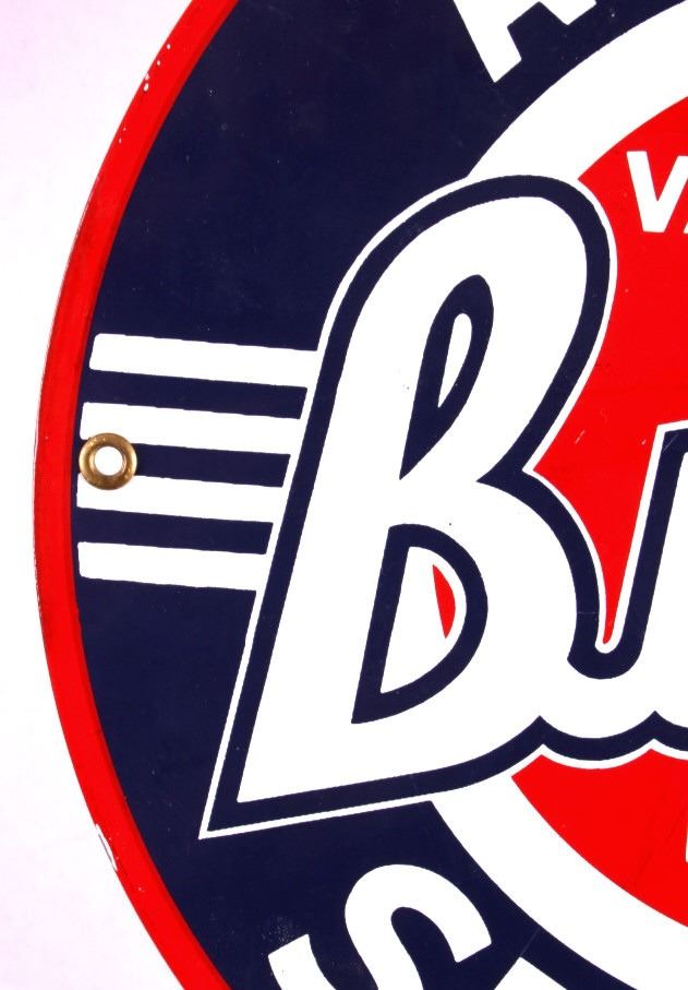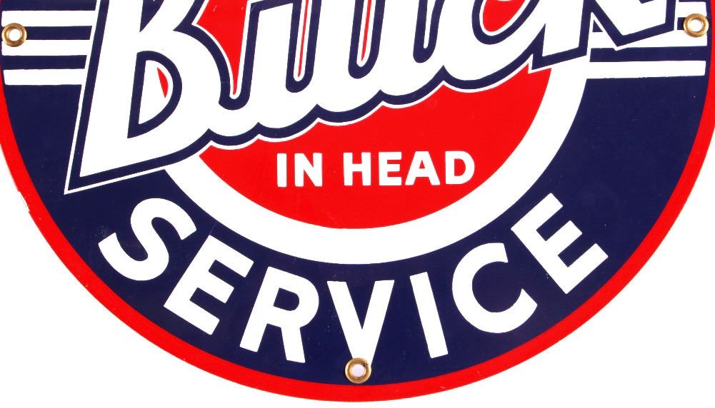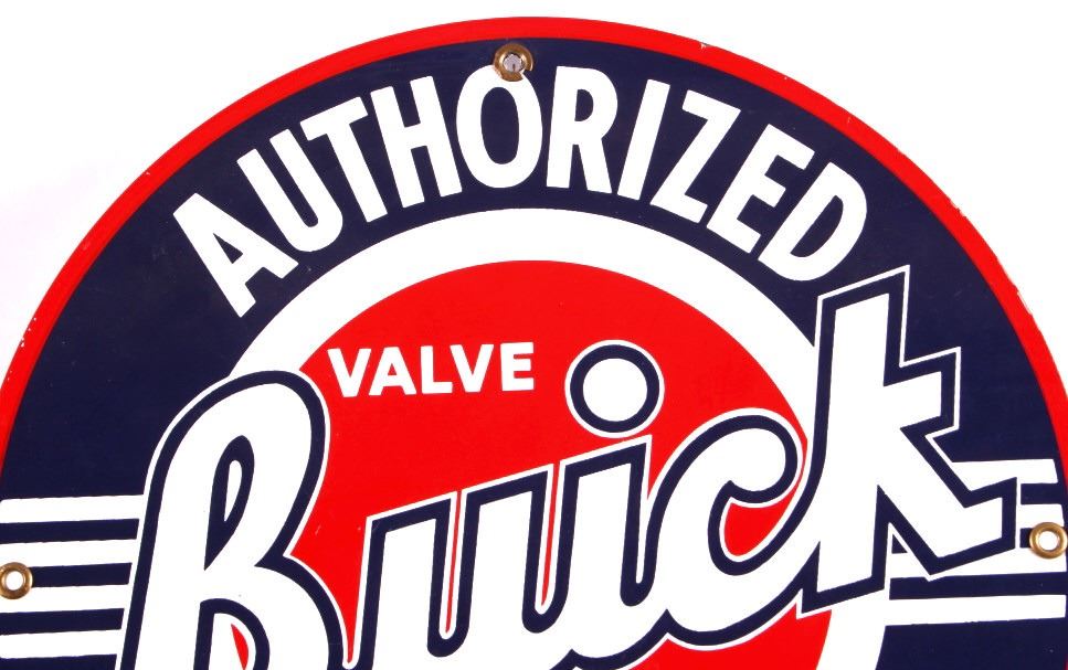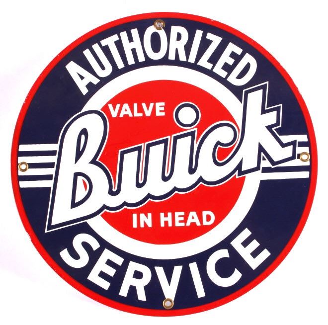 This is a Buick porcelain sign. The sign reads "Authorized Buick Service Valve in Head" and shows four mounting holes reinforced with brass grommets. The Buick sign is in good condition. It measures 11.75" in diameter.