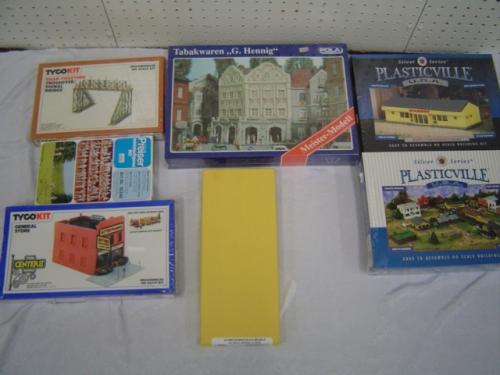 Pola # 1946 G Hennig Tabacco Goods, Bachmann Silver Series # 45522 Buds Convenience Store, # 45532 Vintage Auto Repair Shop, Tyco # 7798 General Store, # 7767 Cross Over Sigment Bridge, Alpine Division Scale Models 574 Old Town Home 3 pkg, Prieser # 16346 unpainted Sports & Leisure figures.
