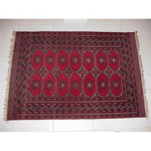 69'' X 49'' Wool Turkestan Bukhara Carpet. Red center fields surrounded by black, white and rust borders. Classic design, in beautiful condition.